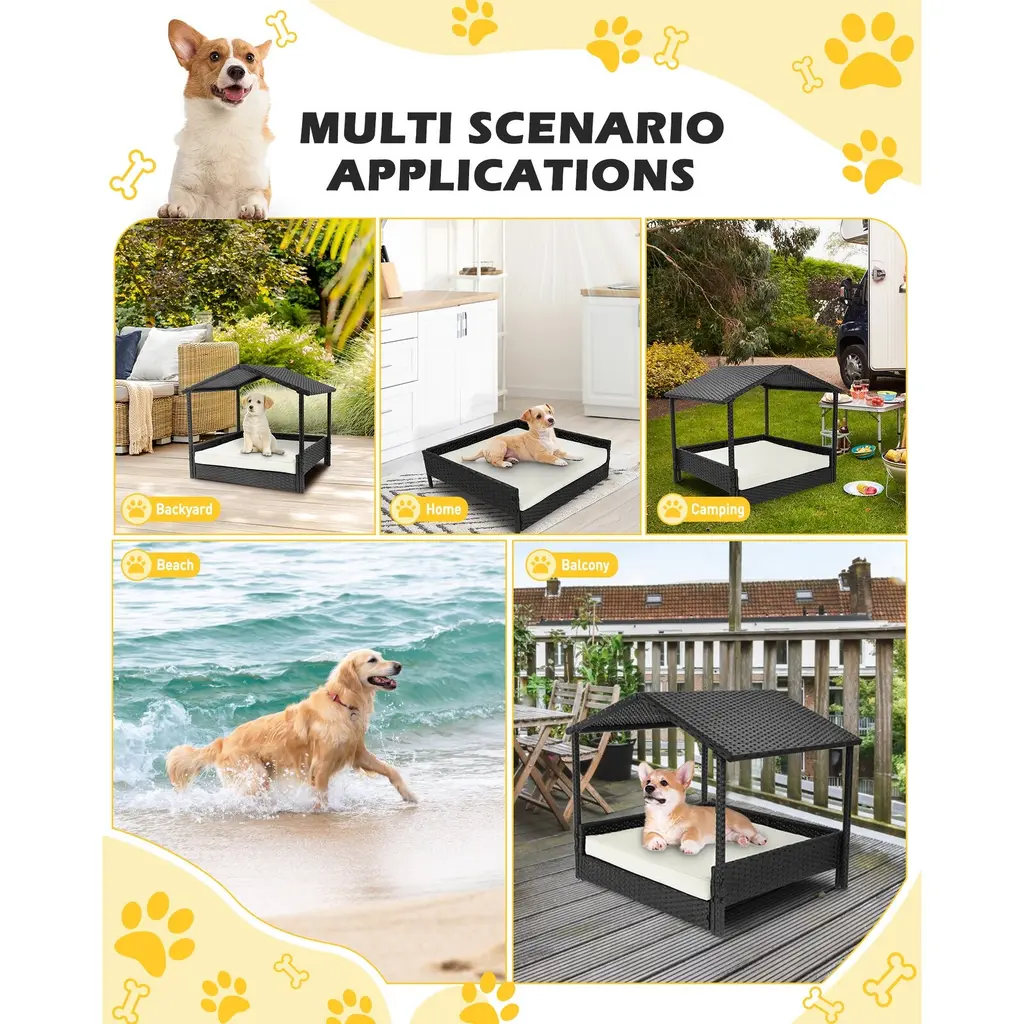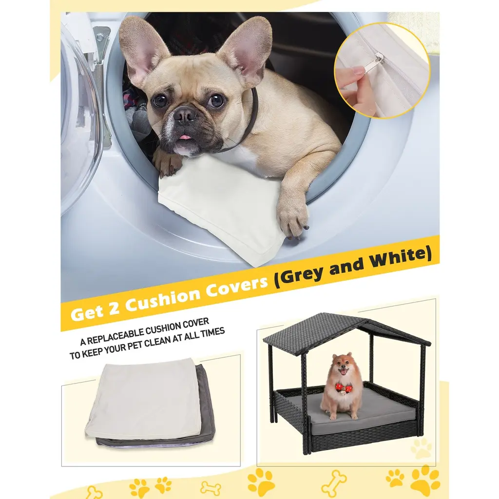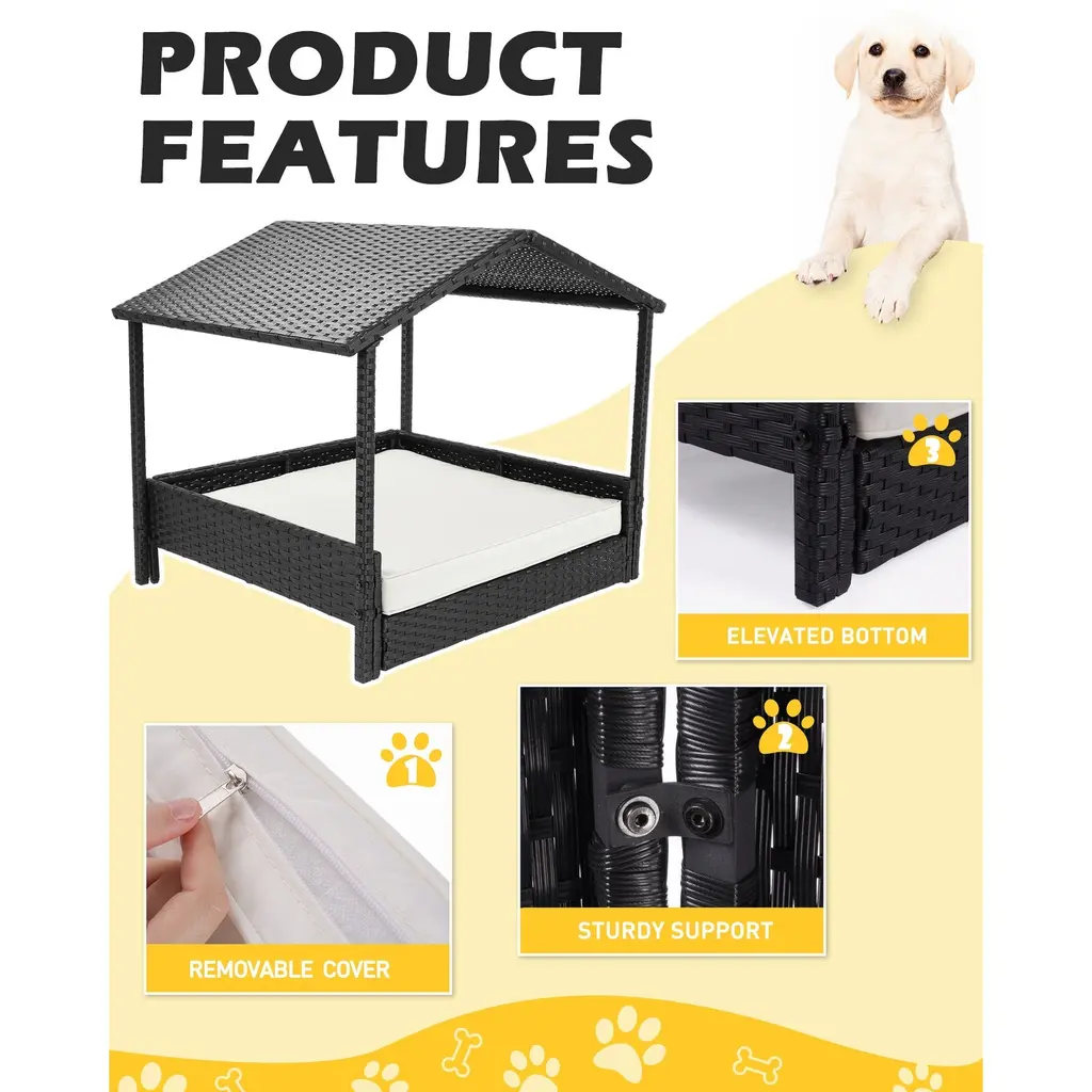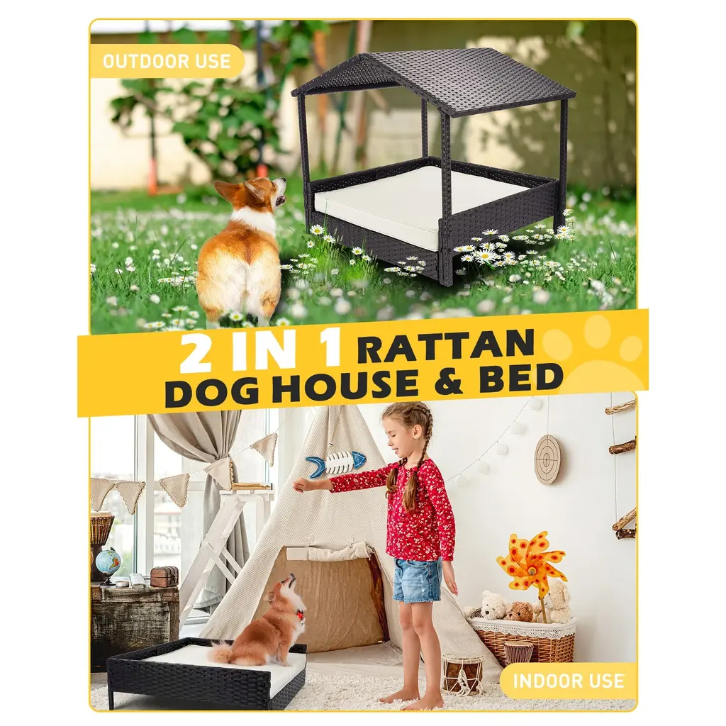 2 In 1 Wicker Pet Bed With Cushion And Canopy, Dog House - White