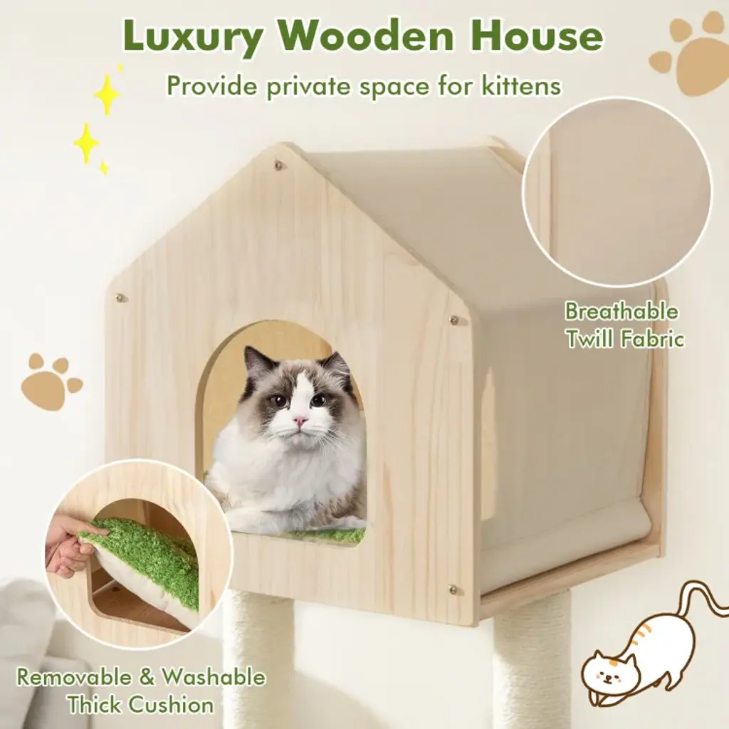 SpecificationsKey FeaturesSturdy and Stable Structure: The 139 cm/55" tall wooden cat tree features a solid pine wood frame (the condo and base are crafted of natural pine wood) and a wide round base, ensuring good stability and long-lasting durability. Besides, with exquisite polishing treatment, the surface is smooth and burr-free. Multiple Resting Spots: The cat tower features a top wooden cat condo with a removable soft cushion inside, providing the ultimate privacy and comfort. And there exists a comfy cat hammock for napping and a bottom soft bed for relaxing and lounging. Furthermore, it includes 2 large platforms for jumping and resting. Durable Cat Scratching Posts: The supporting posts are fully wrapped with natural sisal ropes, which could help cats sharpen their claws while protecting your furniture from scratching. And the sisal scratching posts are wear-resistant, scratch-resistant, and safe, ensuring long term use. Comfy and Soft Lying Experience: The platforms and hammock of this cat climbing stand are designed with premium polyester peach skin covering, keeping warm while providing a comfy skin touch. More than that, it comes with a detachable thickened padded cushion at the bottom, adding extra comfort for your furry friends. Stylish and Elegant Appearance: The 5-tier cat tower could meet kittens' instincts of jumping, resting, playing, observing, and scratching. Additionally, with its bright color, cloud shape, cute house shape, and breathable fabric top, this modern cat tree could attract cats' attention while adding a lovely atmosphere to your home.