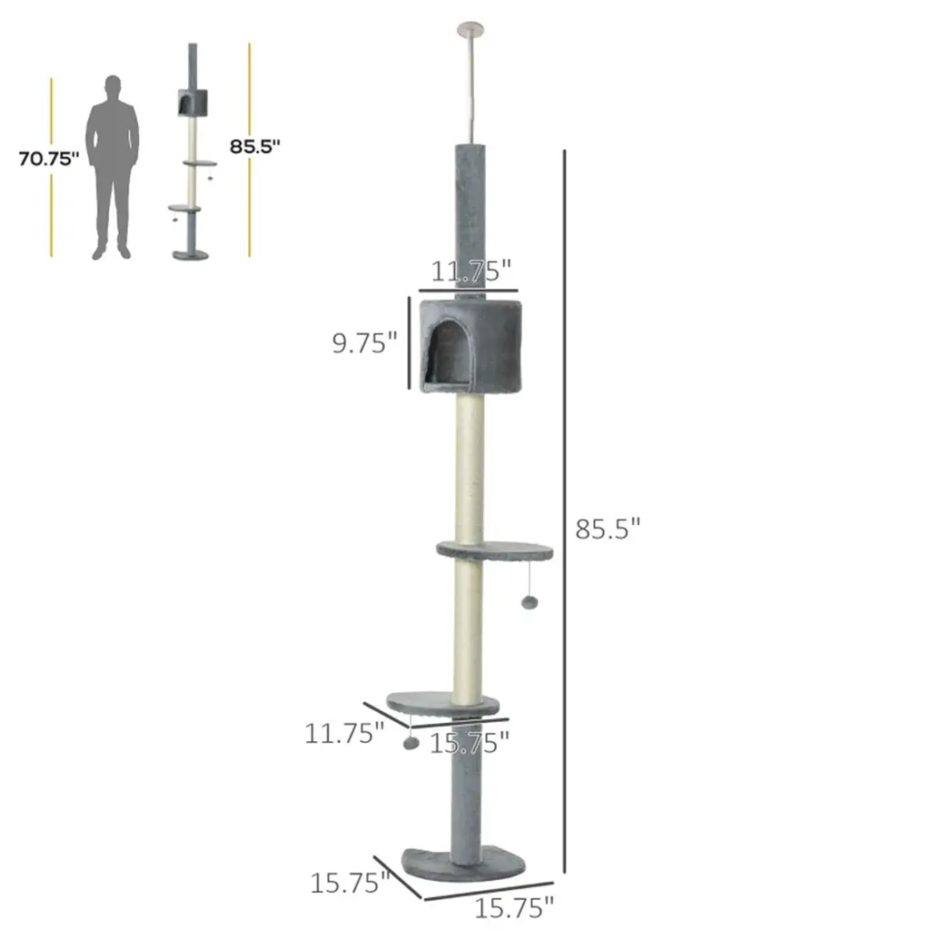 Specifications:Description:This versatile cat tree in a light grey color features a 4-tier design with scratching posts, toys, and cozy resting spots, providing your cat with the perfect space to play and relax. Constructed from durable P2-grade particleboard, sisal, and flannel, it stands at 85.5" tall and measures 15.75" in length and width, offering ample space for your feline friends. The tree can be securely anchored to the ceiling with an included tension rod, and anti-tipping fittings ensure stability for added safety. Ideal for sharpening claws and protecting your furniture, this cat tree is a great addition to any home. Assembly is required for setup.Key Features: