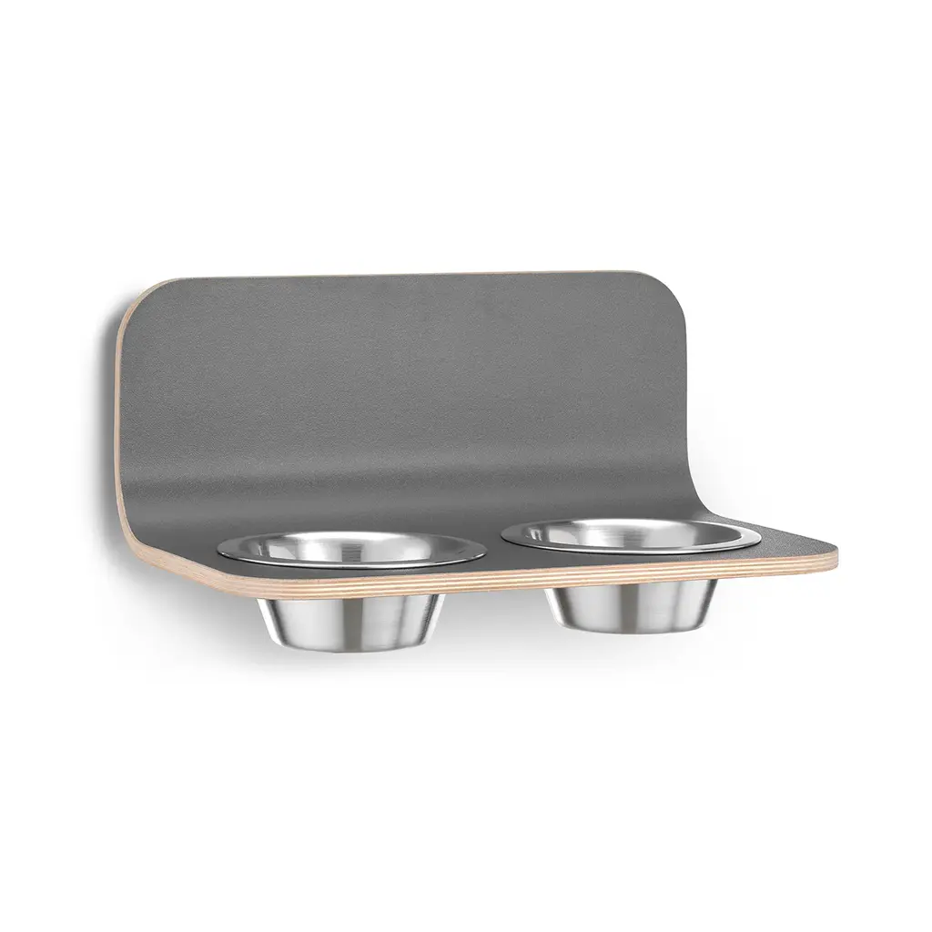 Offering a minimalist design that fits seamlessly into your home, the Arco Dog Feeder from MiaCara brings clever and streamlined style to your everyday routine. Crafted from bent plywood with a high pressure laminate coating, the stainless steel bowls offer a contrasting accent ready to be filled with water and kibble for your furry friend. Easily mounted to your wall for the desired height of your dog, thanks to a clever sliding system, this feeder can be removed at any time to be cleaned and replaced. The curved L design protects your wall from any splashes or dirt while allowing you easy access to clean any mess left under the bowls. Highlights