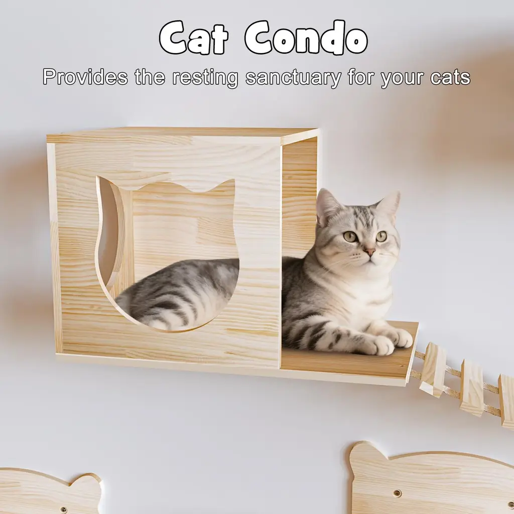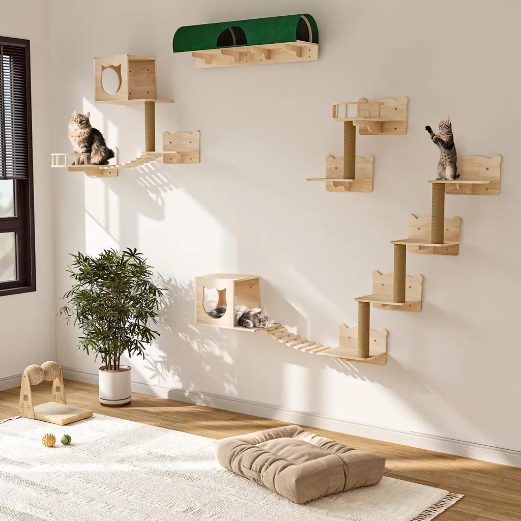 Bossin 9/16/18-Piece Pine Cat Wall Climbing System - Wall-Mounted Shelves Set With Cat Bed, Scratching Post & Tunnel - 9Pcs - New-18pcs