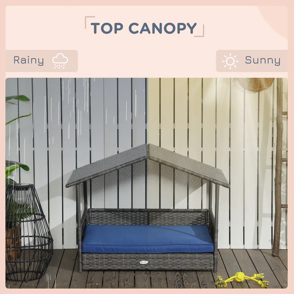 Classic Wicker Dog Bed Dog Outdoor House With Water Resistant Cushion And Rattan Canopy For Small And Medium Dogs - Blue