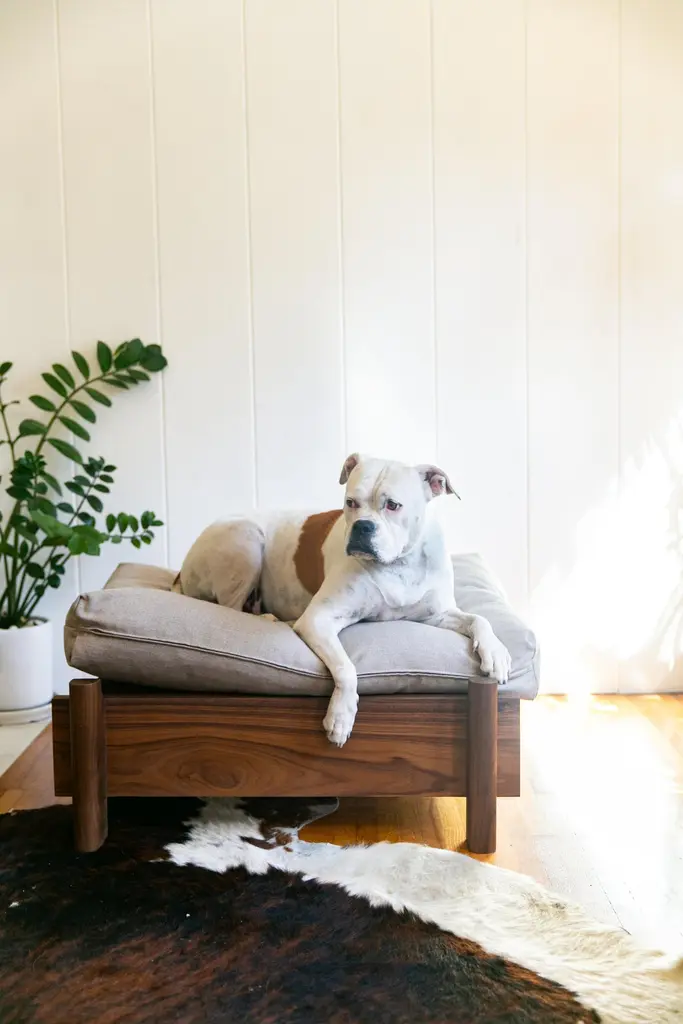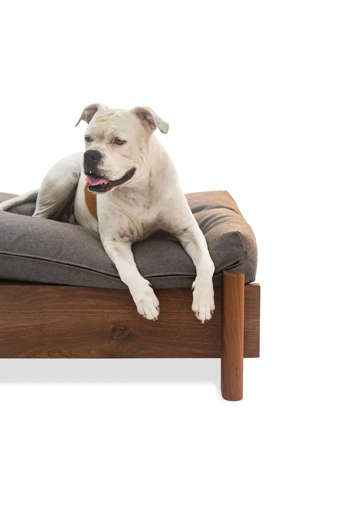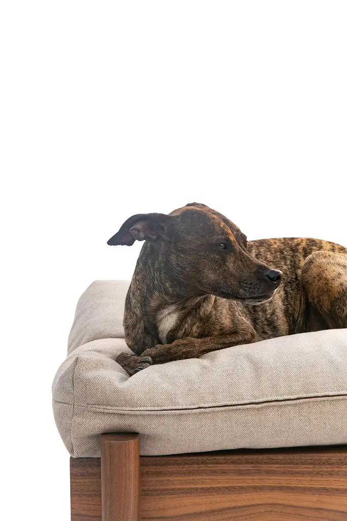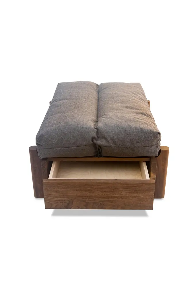 The LAPILO Dog Bed offers both style and functionality. The frame is of solid wood construction, and features a removable and flippable cushion that clips onto the base. The cushion inserts are interchangeable, and cushion covers are sold separately in various fabrics or can be made with your own material. The bed also includes a discrete, soft-close drawer within the wood frame for convenient storage, blending minimalist design with practical use. This sophisticated dog bed appears as an ottoman and is perfect for multi-functional living spaces, combining elegance with utility.SMALL 18"W x 14"D x 12"HLARGE 33"W x 28"D x 12"HCustom sizing is available. PLEASE INQUIRE FOR COM/COL, OR CUSTOMIZATION REQUESTSThis item is hand made to order, please allow 8-10 weeks lead time.Due to the organic nature of wood no two pieces will be the same. Some variation in tone, grain, color, and finish may be different than the images shown on our site. Finish may change over time. Natural wood may display small splits, knots, joint lines, or other organic features, adding unique character to each piece.