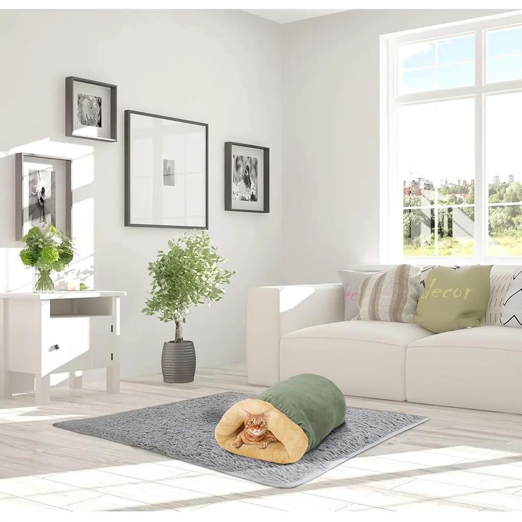 The GOOPAWS 4 in 1 Self Warming burrow pet bed will put your cat or dog into a sweet sleep by providing the extremely soft pillow and/or hugged by strong, cozy bolster. This bed features a super-comfy microfiber outer shell, and soft padding inside that's a combination of fleece and foam. All the best materials to make your dog & cat happy. • Suede filled with extra thick 100% poly fill for maximum comfort. Self-warming insulation radiates heat back to the pet. • Designed with fashion in mind but is also durable, safe, comfortable, and extra cozy for your friend.• Its sturdy bolstered entrance is always open for easy access. Dogs & Cats can play hide and sneak or snuggle inside the crinkle sack for a well-deserved nap. • Four fun patterns: The "burrow" configuration gives your Dog & Cat a snug and warm little hideout. Press it flat and kitty can stretch out on top and stay cool. The "cup" setup is an open, nest, and the "pod" is similar but with microfiber lining. • Machine washable for easy, stress-free cleaning. Simply wash on the gentle cycle with cold water.