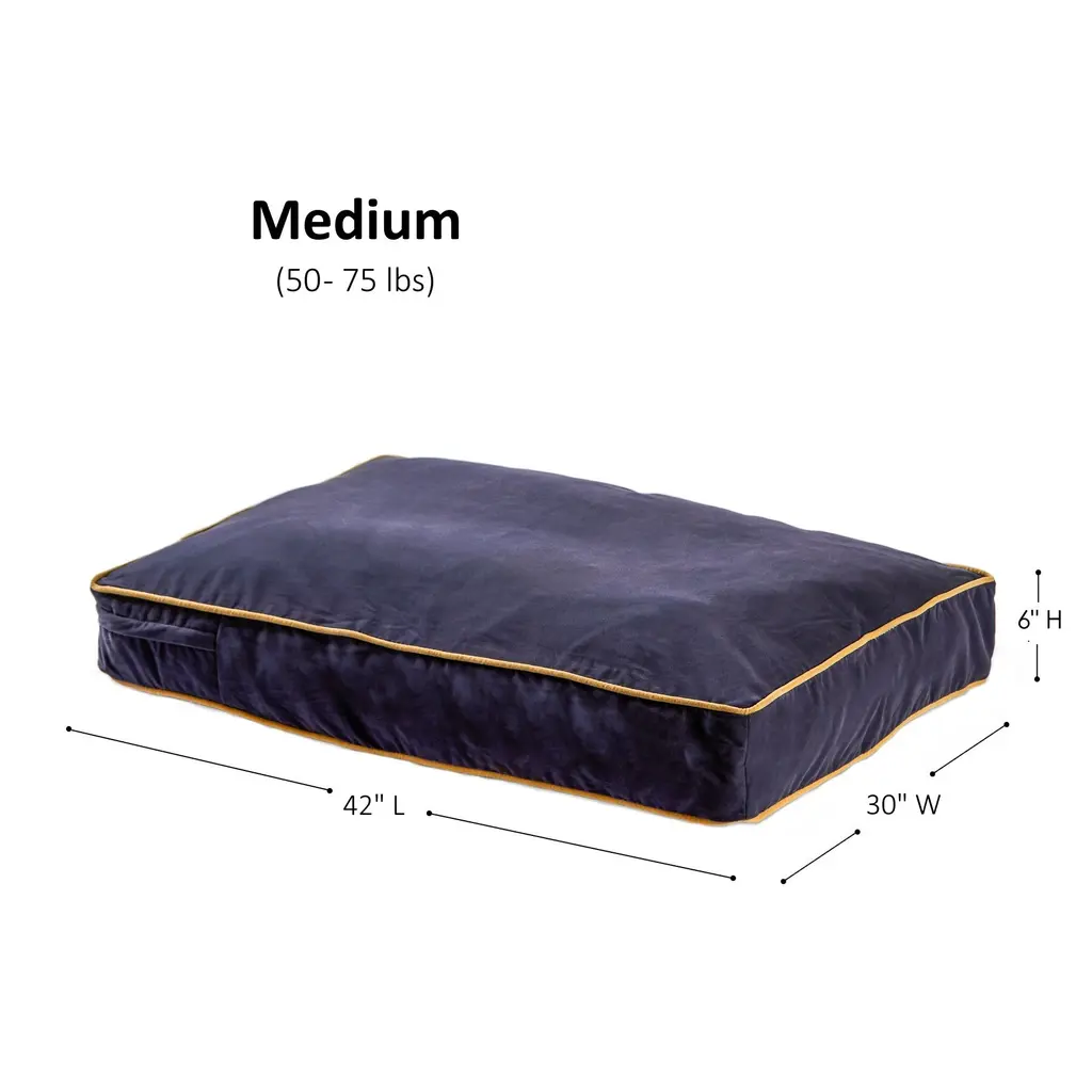 The Happy Hounds Busby Dog Bed is a deluxe rectangle pillow bed featuring durable, double-sewn boxed edges with decorative contrast cording. Its reversible design allows for longer use. The Busby's heavy-duty microfiber fabric is water resistant, and comes with a hefty hidden zipper to prevent chewing. This bed is filled with 100-percent post-consumer recycled plastic poly-fiber fill. Its cover is removable and machine washable. Meet our Models:Since this item is made to order, it may take 1-10 business days for it to leave the warehouse. Unfortunately the item cannot be expedited.