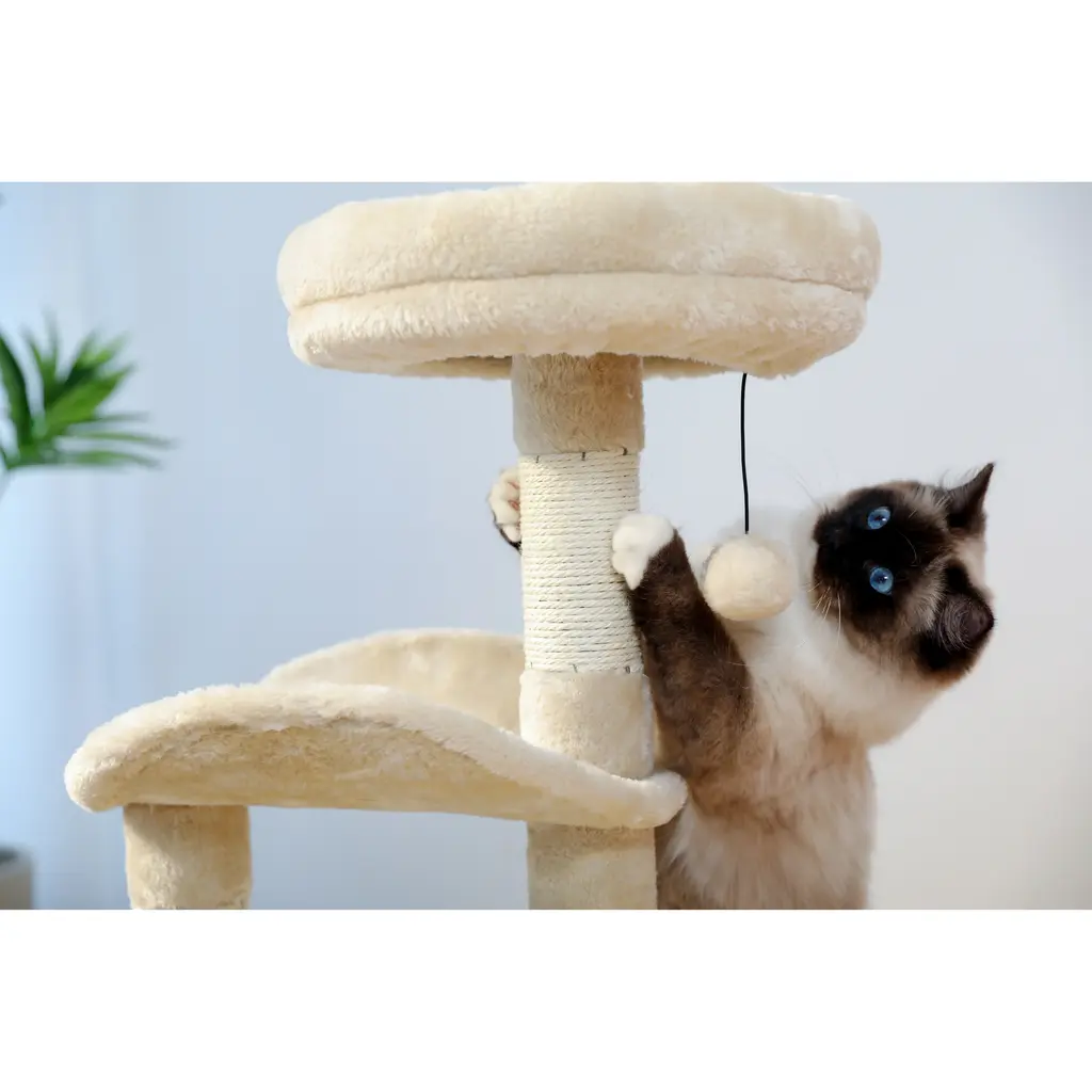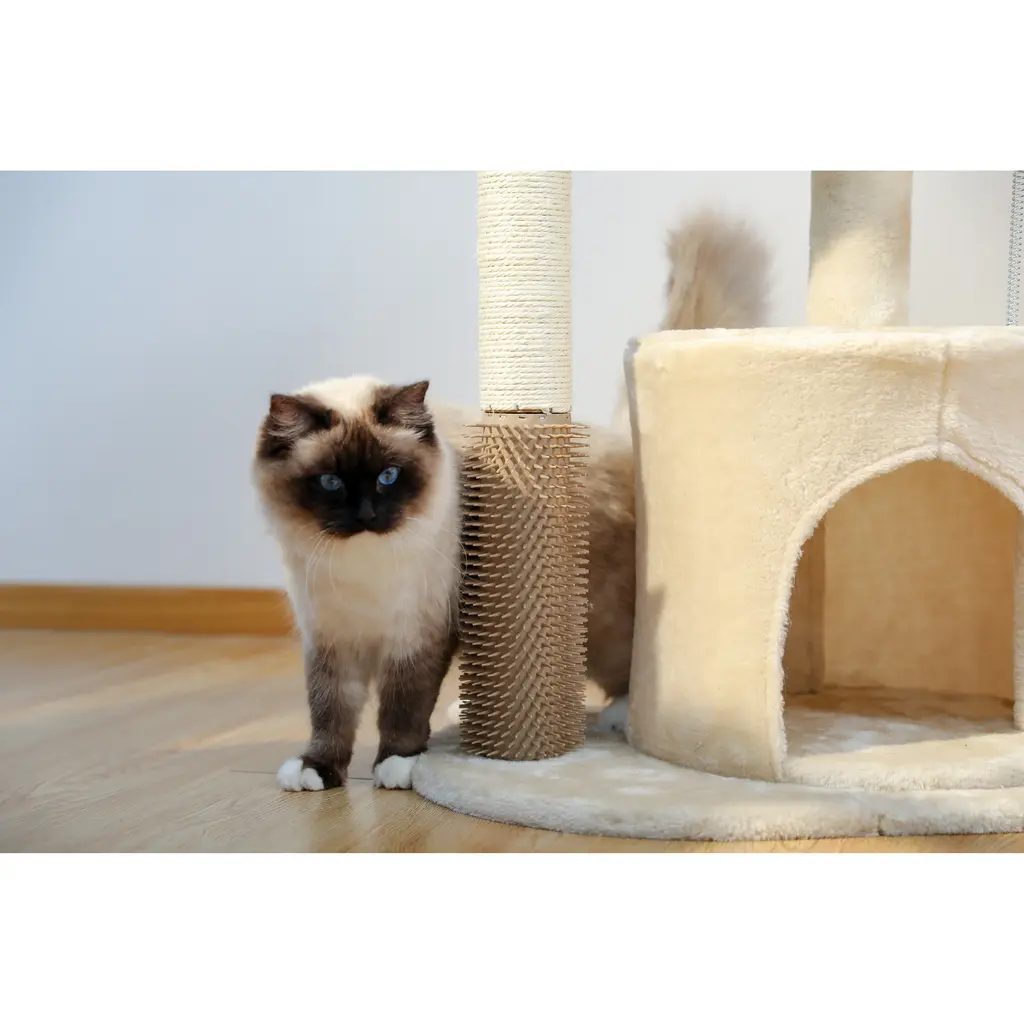Indoor Medium Cat Tower With Cat Toy, Condo With Self Groomer Brush, Scratching Post, Dangling Balls - Beige