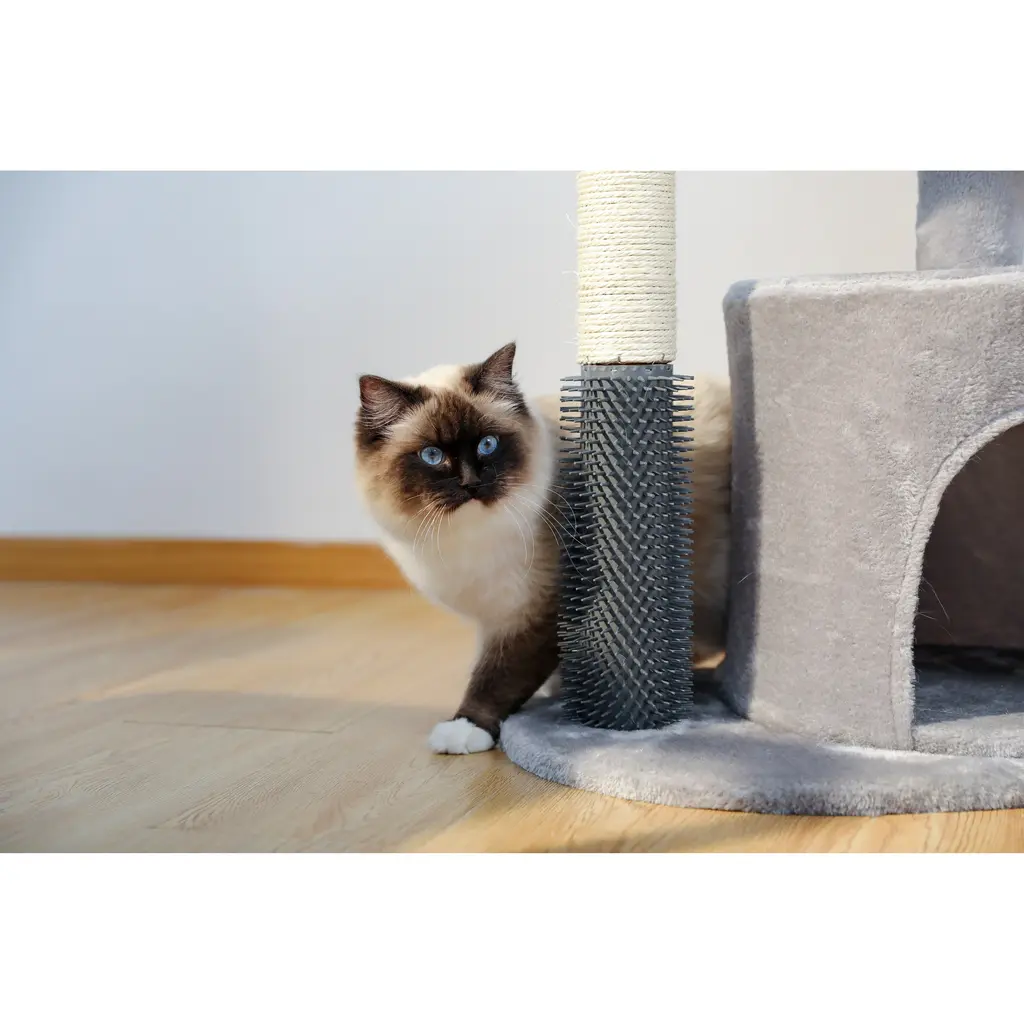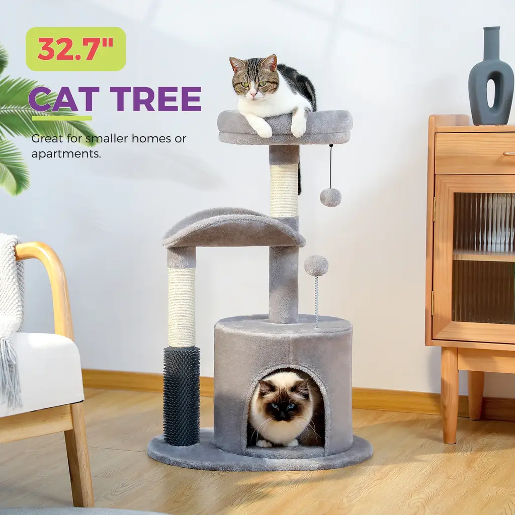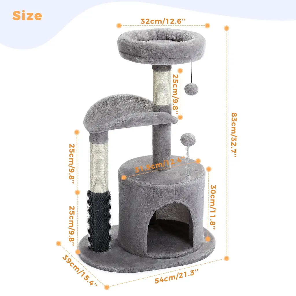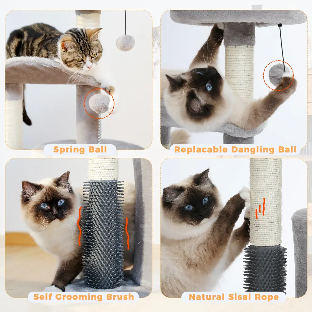 Indoor Medium Cat Tower With Cat Toy, Condo With Self Groomer Brush, Scratching Post, Dangling Balls - Grey
