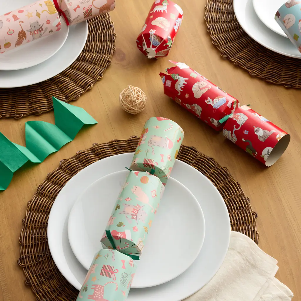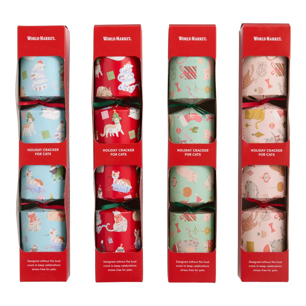 A British tradition comes to life with World Market Christmas crackers, featuring festive new designs every holiday season. Handcrafted by artisans in South Africa from red, green, pink, and blue paper adorned with playful cat illustrations, each cracker snaps open quietly so as not to startle your pet, and contains a toy to present to your favorite feline.