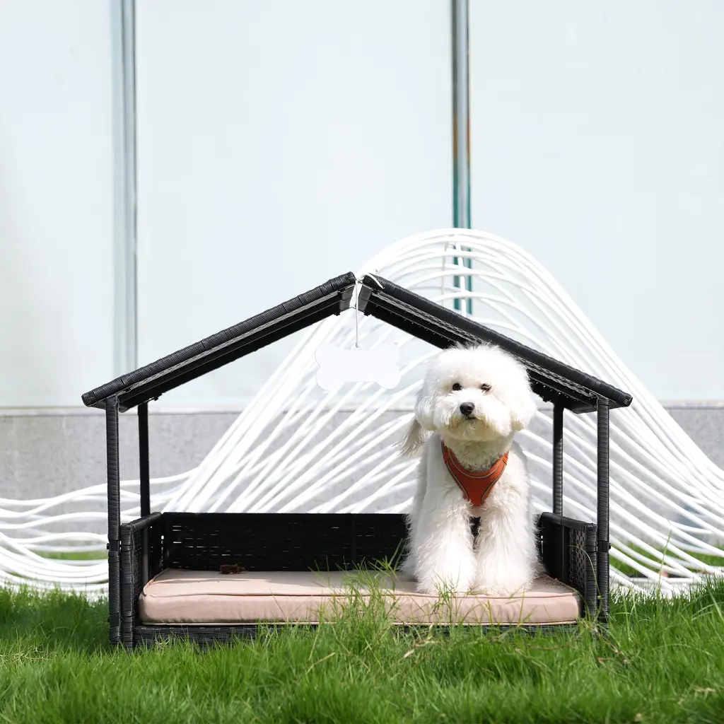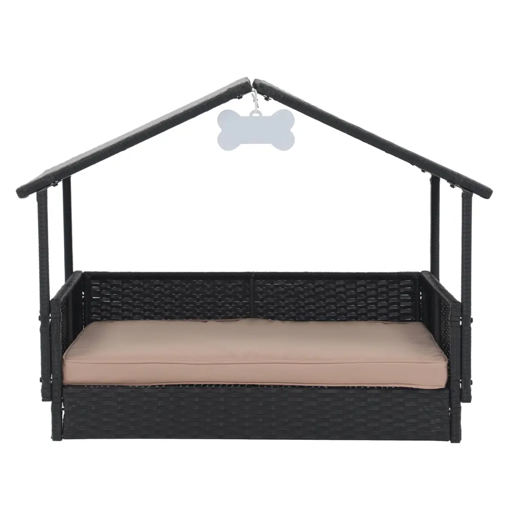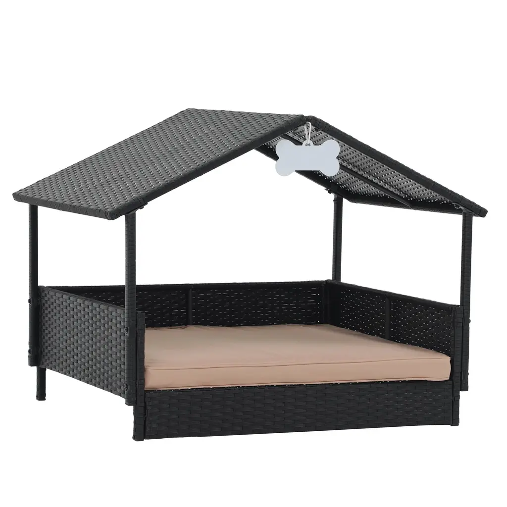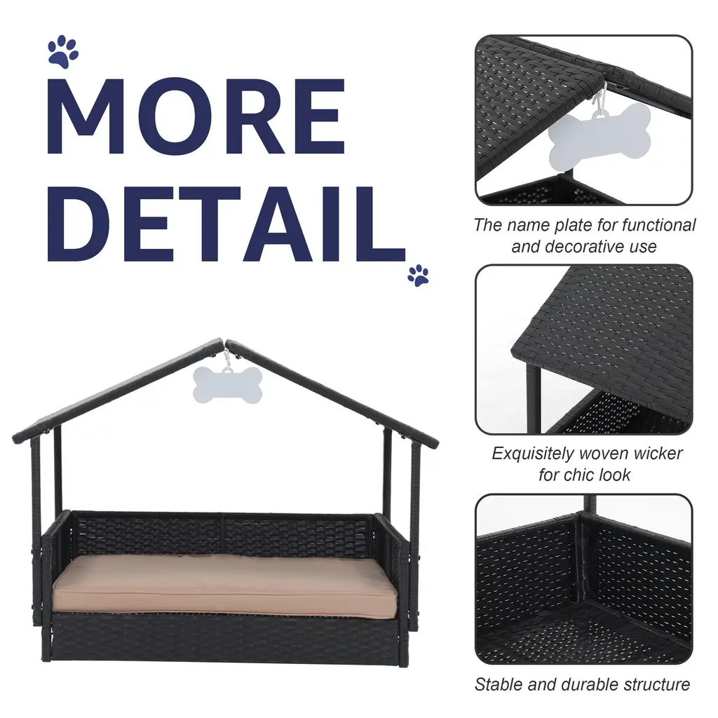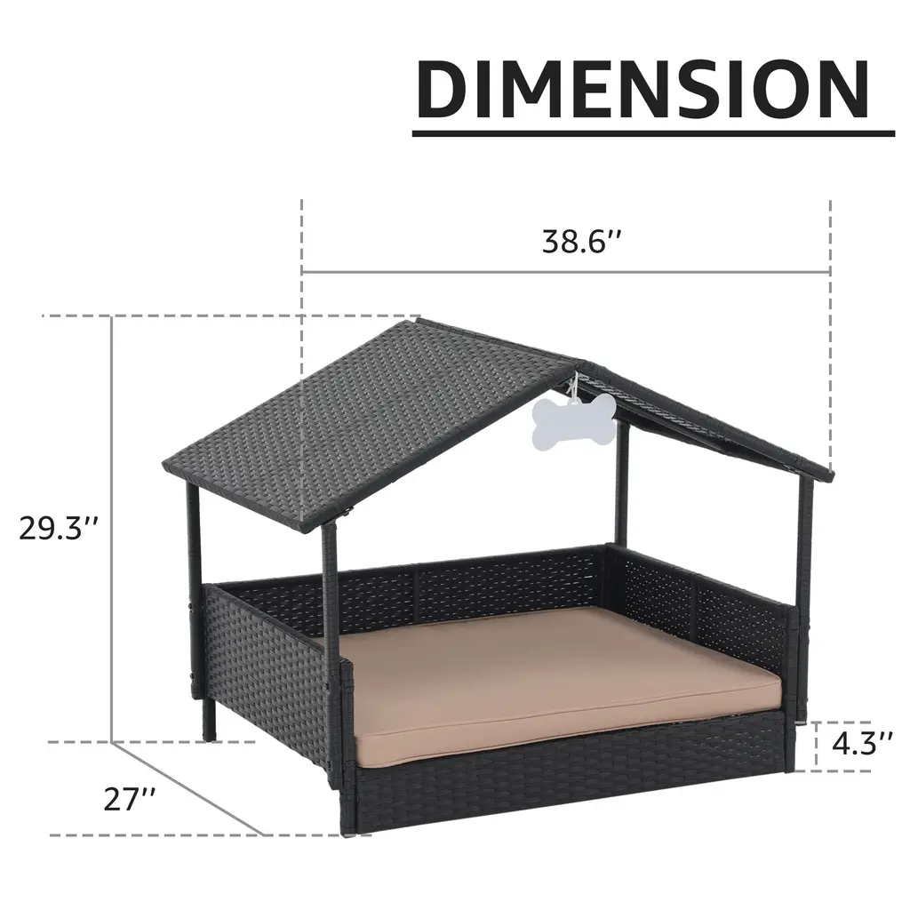 Upgrade your furry friend's outdoor space with this comfortable and chic dog house. Crafted from durable wicker and solid steel frame, it's built to withstand any weather conditions and allows low maintenance. Completed with a sponge padded cushion for ultimate comfort, your beloved pup will have a cozy and chic retreat. Let them relax in style and enjoy the great outdoors with this ideal addition to any pet owner's backyard.Features:Easy to put together with detailed manual and complete accessoriesCushion cover with smooth zipper for easy cleaning Come with name plate, simply hang it on the dog housePerfect for outdoor space like patio, yard or porchConstruction of high-quality wicker and powder-coated steel frame for long-term use outdoors Specification:Material: Wicker, steel, fabricSize: 27” D x 38.6” W x 29.3” H