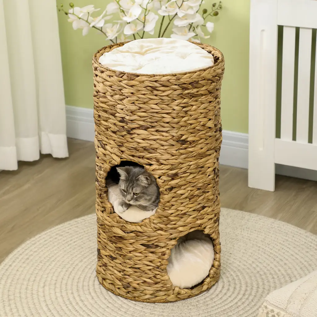 Cat Hideaway: If you've ever found your cat napping in a chair pushed into a table, you know they love to rest in tucked-away hiding spots. This four-story design provides three layers of cozy hideaways with 7.5" holes, where kitties can feel safe and secure in their own space.Four Beds: Our plush pet cushions are coated in soft fabric for warm, cushy, peaceful rest. Featuring four beds in total, our raised cat bed tower can accommodate homes with anywhere from one to four feline friends.Hand-Woven Water Hyacinth: This cat tower for indoor cats is hand-woven from natural materials to bring charm to your living space, whether it's modern, boho, farmhouse, or eclectic. The braided texture of our kitty nest blends cohesively with many interior design choices.Stacked for Height and Space-Saving: Provide more beds while taking up less floorspace, and give cats the height they're drawn to.Cat Tree Info: Overall Dimensions: 15.75" Dia. x 28.75" H. Inner Height: 8.75" H (Each Story). No Assembly Required. Note: Please Ensure Your Cat Fits.