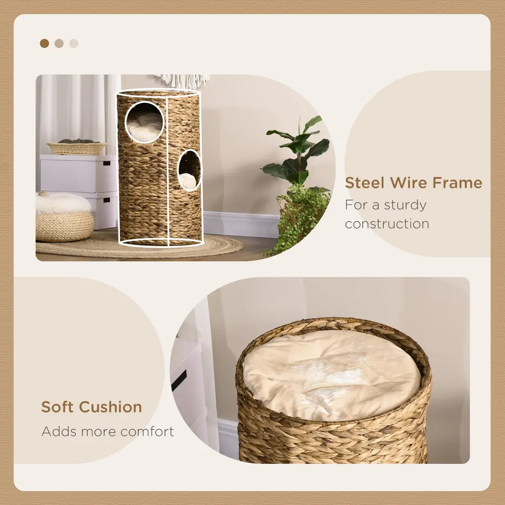Descriptions:Save space and offer your cat the height they love to hang in. Hand-woven from natural water hyacinth, our cat condos for indoor cats offer a stacked design with four layers, accommodating multiple kitties or giving one extra room. This four-story cat zone features three hideaways tucked away behind 7.5" holes, enhancing the comfort of cat naps and creating a hidden feel all feline friends are drawn to. Upgrade your fur baby's naps with PawHut.Features:● Four beds in total with softly coated plush cushions for restful sleep● Three hideaway enclosed cat beds tucked away behind 7.5" holes● Hand-woven from natural water hyacinth to blend with various interior design choices● Stacked design saves floorspace while accommodating more than one cat● Please ensure your cat fits before purchasing● No assembly requiredSpecification:● Color: Sand● Materials: Steel Wire, Water Hyacinth, Polypropylene Cotton● Overall Dimensions: 15.75" Dia. x 28.75" H● Inner Height: 8.75" H (Each Story)● Opening Size: 7.5" Dia.● Cushion Dimensions: 15" Dia. x 0.75" H● Item Label: D30-697V00LR