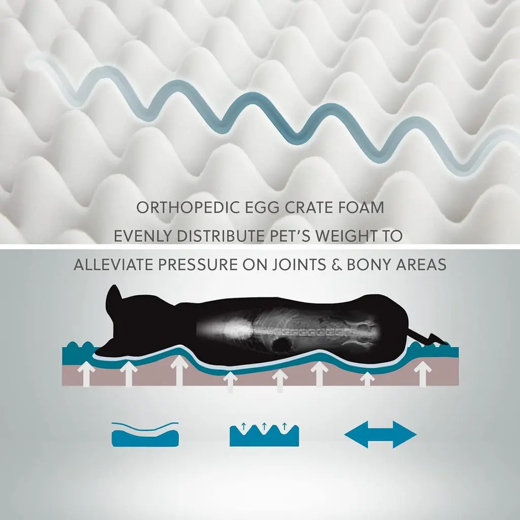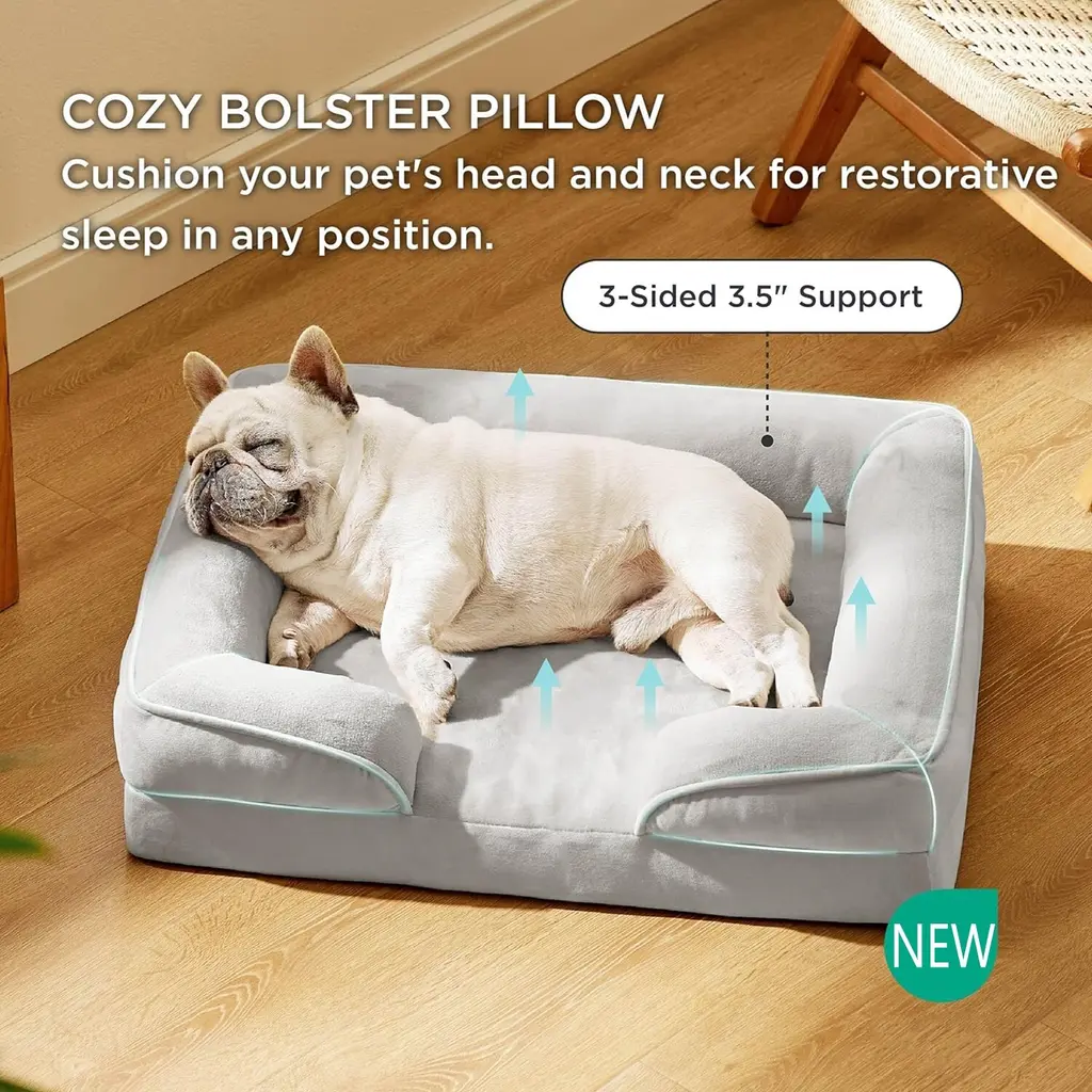 Our orthopedic dog sofa is designed to give your pet unparalleled support for a deep, dreamy sleep. High-density egg-crate foam helps distribute weight evenly and provides the perfect amount of pressure relief and joint support. The 4-sided bolster design promotes ultimate comfort and security, offering your pet a variety of cozy positions to snuggle. The cushioned bolster shape is deeply filled to support your pet’s head and neck for a more restful sleep. And the lowered entrance protects your pet's knees and promotes accessibility. The durable foam mattress is encased in a waterproof liner to fully protect the foam from spills, water damage, or accidents. Remove the zippered cover in seconds and machine wash for easy care.This supportive dog bed is wrapped in our velvety soft flannel fabric, offering soothing comfort that your furry friend will find cozy and relaxing.The non-skid bottom reduces slips and protects your dog.
