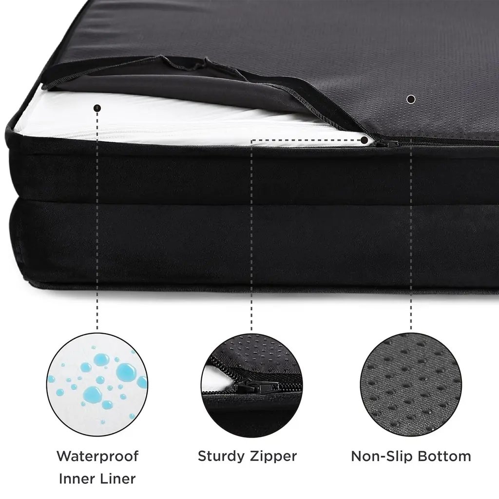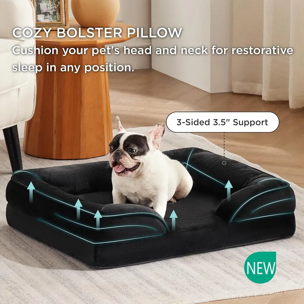 Our orthopedic dog sofa is designed to give your pet unparalleled support for a deep, dreamy sleep. High-density egg-crate foam helps distribute weight evenly and provides the perfect amount of pressure relief and joint support. The 4-sided bolster design promotes ultimate comfort and security, offering your pet a variety of cozy positions to snuggle. The cushioned bolster shape is deeply filled to support your pet’s head and neck for a more restful sleep. And the lowered entrance protects your pet's knees and promotes accessibility. The durable foam mattress is encased in a waterproof liner to fully protect the foam from spills, water damage, or accidents. Remove the zippered cover in seconds and machine wash for easy care.This supportive dog bed is wrapped in our velvety soft flannel fabric, offering soothing comfort that your furry friend will find cozy and relaxing.The non-skid bottom reduces slips and protects your dog.