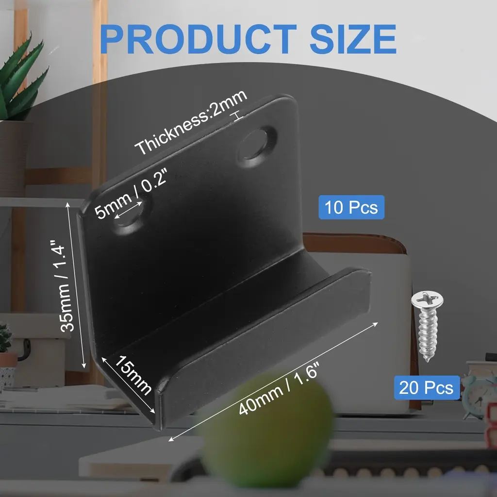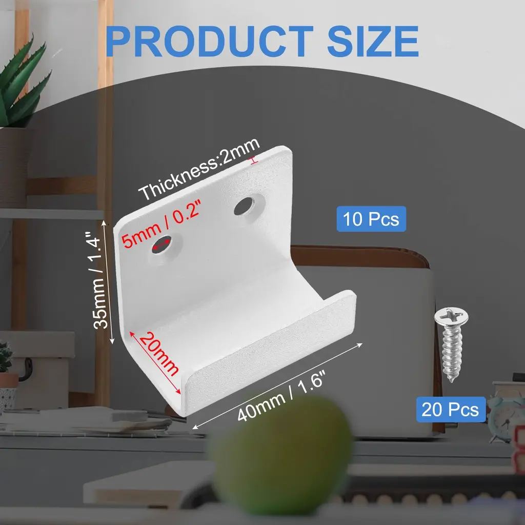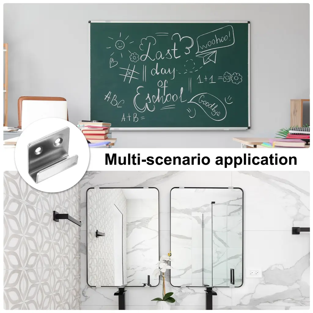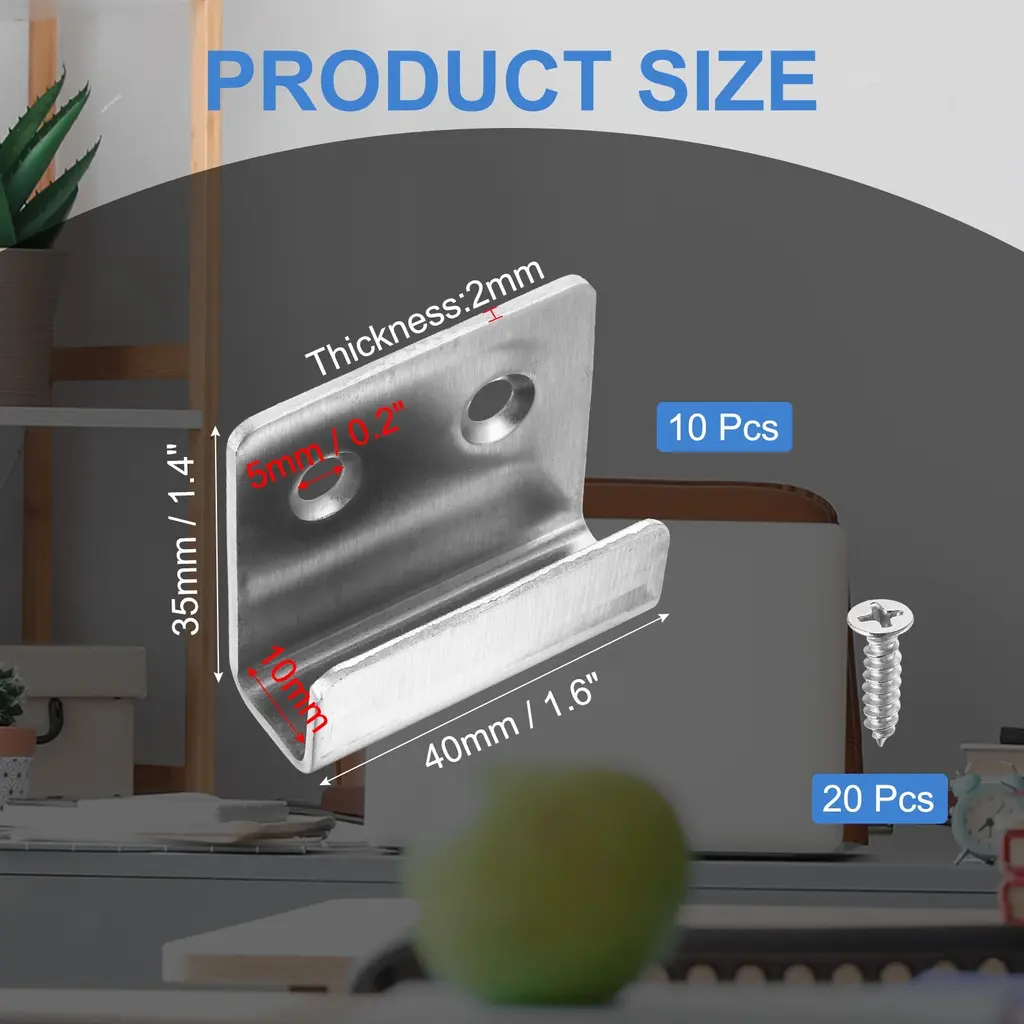 Description:Quality Material: The mounting bracket is made of stainless steel, and the surface is brushed, fine workmanship, sturdy and durable, anti-corrosion,wear-resistant, and not easy to rust, brushed finish not only adds to their aesthetic appeal but also enhances their durabilityDurable Tile Hanger: The surface of this wall-mounted hook is smooth and burr-free, one-piece die-casting, and has no welding, can effectively save space for you and keep it tidyEasy To Use: Simple operation, you only need to drill holes in the wall, requiring the hangers to be mounted on a wall using screws (provided in sets), and tighten the screws, and then the tiles, mirrors, or frames are easily slotted into the hanger's grooveWide Application: The tile display wall hanger is suitable for tile walls and doors in homes, living rooms, bathrooms, gyms, offices, and other places. It can be used to hang photo frames, mirrors, billboards, clothes, caps, towels, etc.Specification:Color: SilverMaterial: Stainless SteelTotal Size:40mm x 35mm/1.6" x 1.4" (L*H)Inner Width: 10mmHole Diameter: 5mm / 0.2"Thickness:2mmPackage Content10 Pcs x Mounting Bracket20 Pcs x Stainless Steel Screws