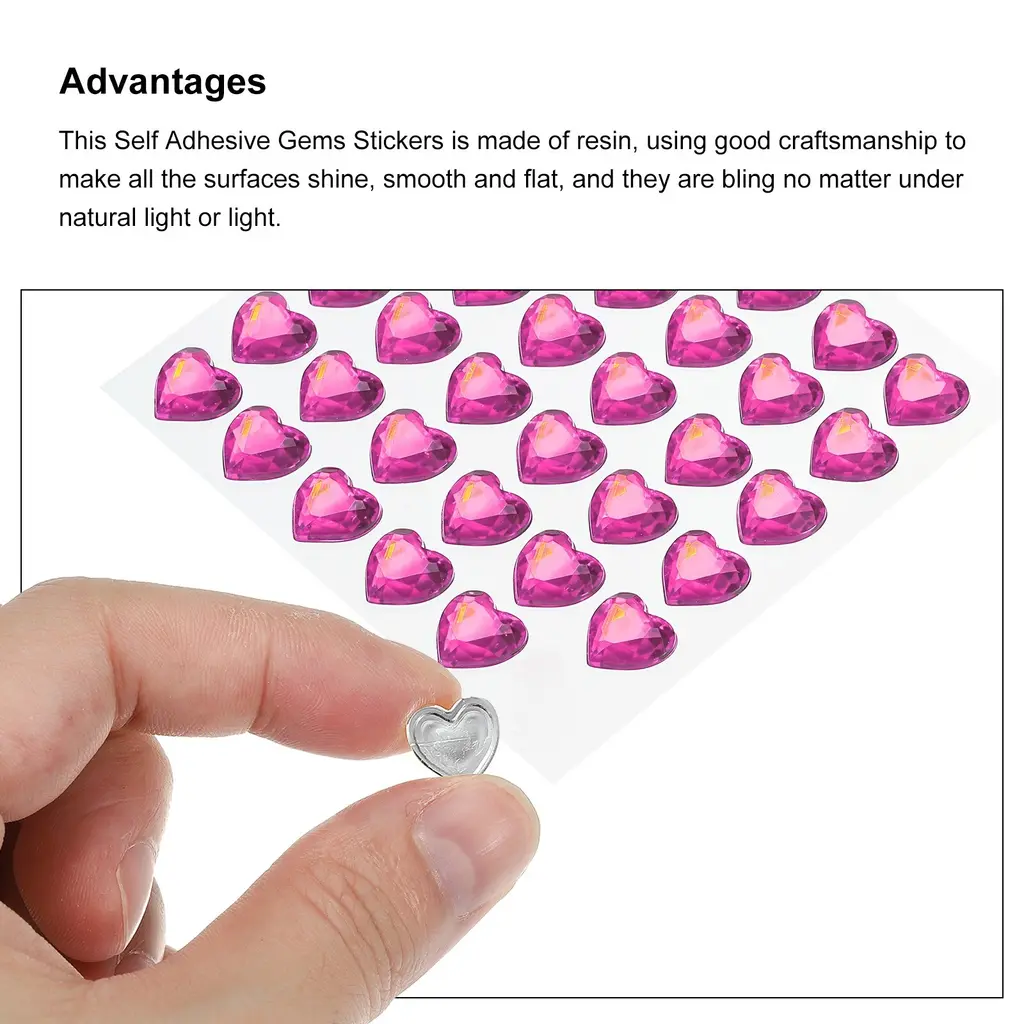 What is this?Heart Rhinestone can mainly be used to decorate different occasions and items in your life. You can use it diy cards or other crafts, also can be used to decorate clothes, bags, mobile phones, bracelets, necklaces, accessories, etc., and you can also use it for decoration on different parties, such as weddings, birthday parties, and other holidays, etc.What will I get?Color: Dark PinkMaterial: ResinWide: 10mm/0.39inchIn the package of: 144 Pcs x Self Adhesive Gems StickersAre there any advantages of the product?1. This Self Adhesive Gems Stickers is made of resin, using good craftsmanship to make all the surfaces shine, smooth and flat, and they are bling no matter under natural light or light.2. The back of this jewelry sticker is flat, you can easily use them for DIY, stick them on cards, gift boxes, photo frames, clothes, hats, or DIY of various jewelryHow to use it?Wipe the surface of the item you want to paste clean, use tweezers to remove the heart rhinestone from the sticker, and then stick it on the surface of the item, press it to make sure it is tight.What should I notice?Within 48 hours of use, do not let the craft come into contact with liquids