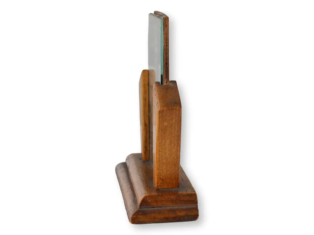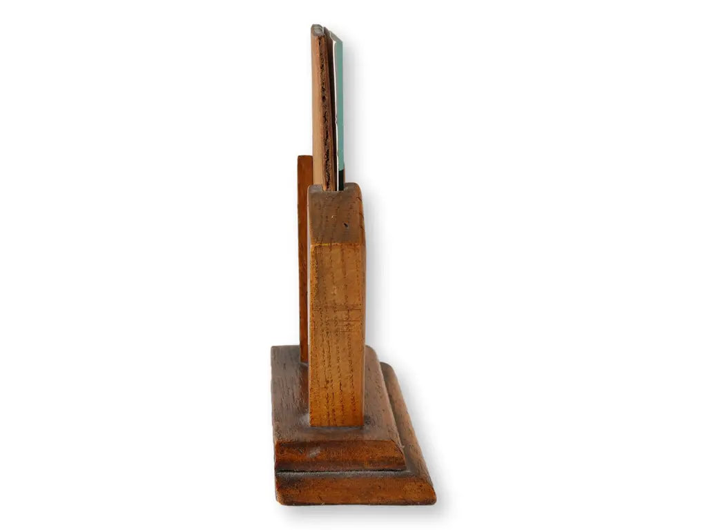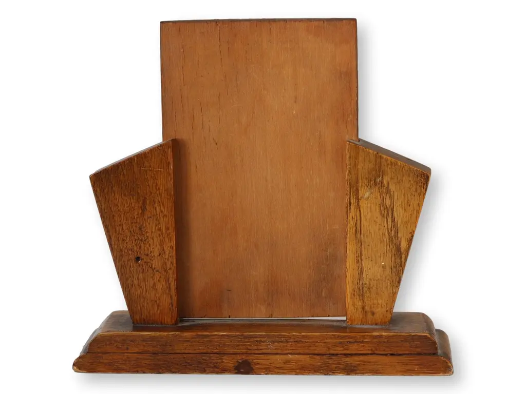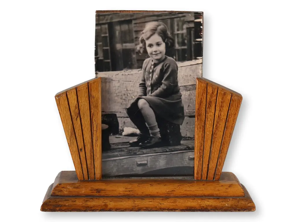 920s English Art Deco photo frame featuring carved oak in classic geometric fan motif. Clean lines and original glass offer a perfect blend of warmth and modernist appeal. Ideal for showcasing vintage portraits or adding period charm to a bookshelf or desk. Unsigned.