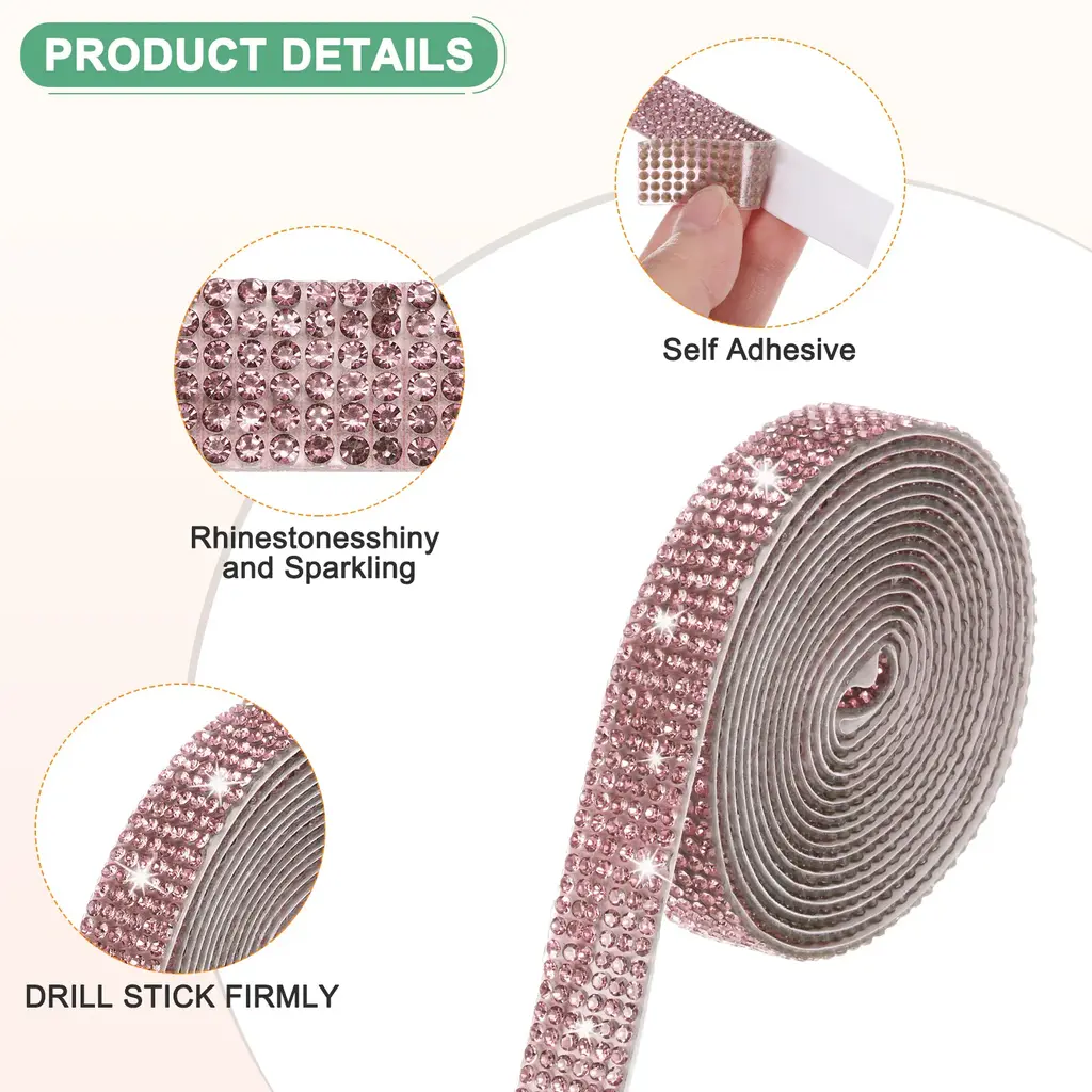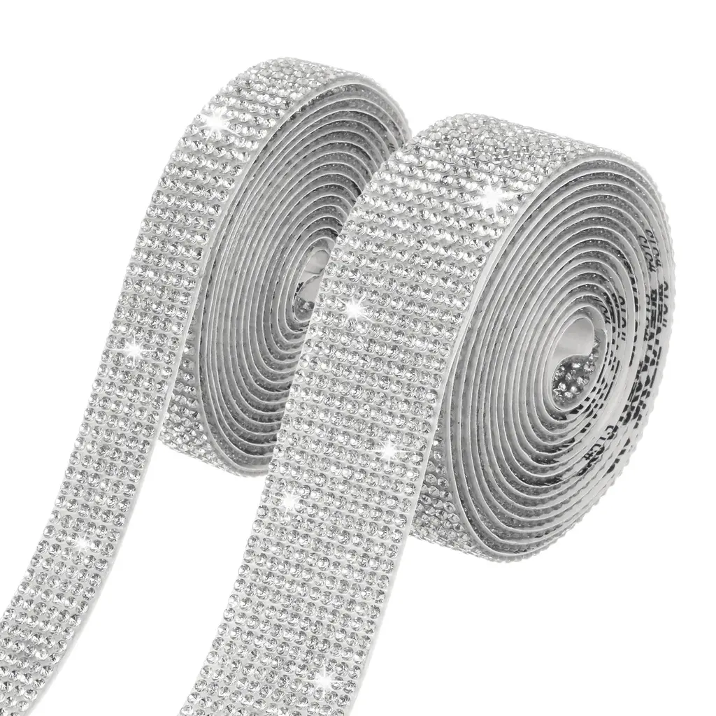 PRODUCT APPLICATIONSOur rhinestone ribbons have various applications. They can be used for various craft projects such as creating hair accessories, wreaths, vases, picture frames, candle holder decorations, and more. It can also be used for weddings, Christmas, birthdays, and dates, you can also use it for DIY decorative necklaces, bracelets, hair accessories, bridal belts, or for bouquets and rhinestone trim for furniture.PRODUCT DETAILS & INCLUDE√ Material: Rhinestone√ Color: White√ Overall Size: Length:185cm/2 yards x 1 cm/0.39 Inch;Width:1.35cm/0.53 Inch;2.7cm/1.06 Inch;√ Package Inclue:2 Rolls x Self Adhesive Rhinestone Chain Ribbon in different sizesPRODUCT ADVANTAGES1. The rhinestone material of this ribbon adorned with glitters is durable and sturdiness, flexible, and sparkle, ensuring a comfortable and pleasant feel when handling or wearing it.2. Our crystal rhinestone diamond ribbon can be reused, sturdy not easy to break, deform, or bend, and will not fall off the string. And DIY self-adhesive for easy decoration.INSTALLATION1. Clean the items' surfaces;2. Cut out the desired length according to your needs;3. Tear off the sticker from the back;4. Place it on a smooth surface to decorate, the press