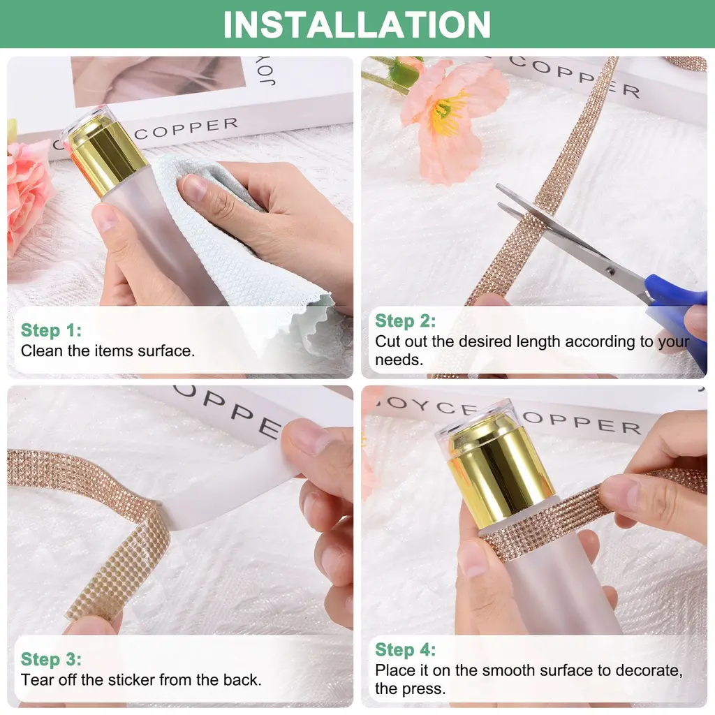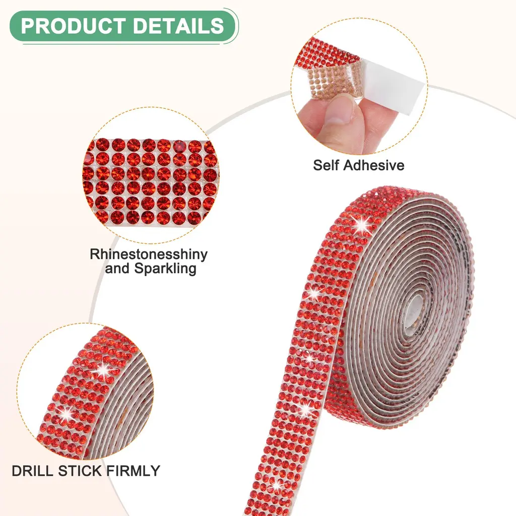 PRODUCT APPLICATIONSOur rhinestone ribbons have various applications. They can be used for various craft projects such as creating hair accessories, wreaths, vases, picture frames, candle holder decorations, and more. It can also be used for weddings, Christmas, birthdays, and dates, you can also use it for DIY decorative necklaces, bracelets, hair accessories, bridal belts, or for bouquets and rhinestone trim for furniture.PRODUCT DETAILS & INCLUDE√ Material: Rhinestone√ Color: White√ Overall Size: Length:185cm/2 yards x 1 cm/0.39 Inch;Width:1.35cm/0.53 Inch;2.7cm/1.06 Inch;√ Package Inclue:2 Rolls x Self Adhesive Rhinestone Chain Ribbon in different sizesPRODUCT ADVANTAGES1. The rhinestone material of this ribbon adorned with glitters is durable and sturdiness, flexible, and sparkle, ensuring a comfortable and pleasant feel when handling or wearing it.2. Our crystal rhinestone diamond ribbon can be reused, sturdy not easy to break, deform, or bend, and will not fall off the string. And DIY self-adhesive for easy decoration.INSTALLATION1. Clean the items' surfaces;2. Cut out the desired length according to your needs;3. Tear off the sticker from the back;4. Place it on a smooth surface to decorate, the press