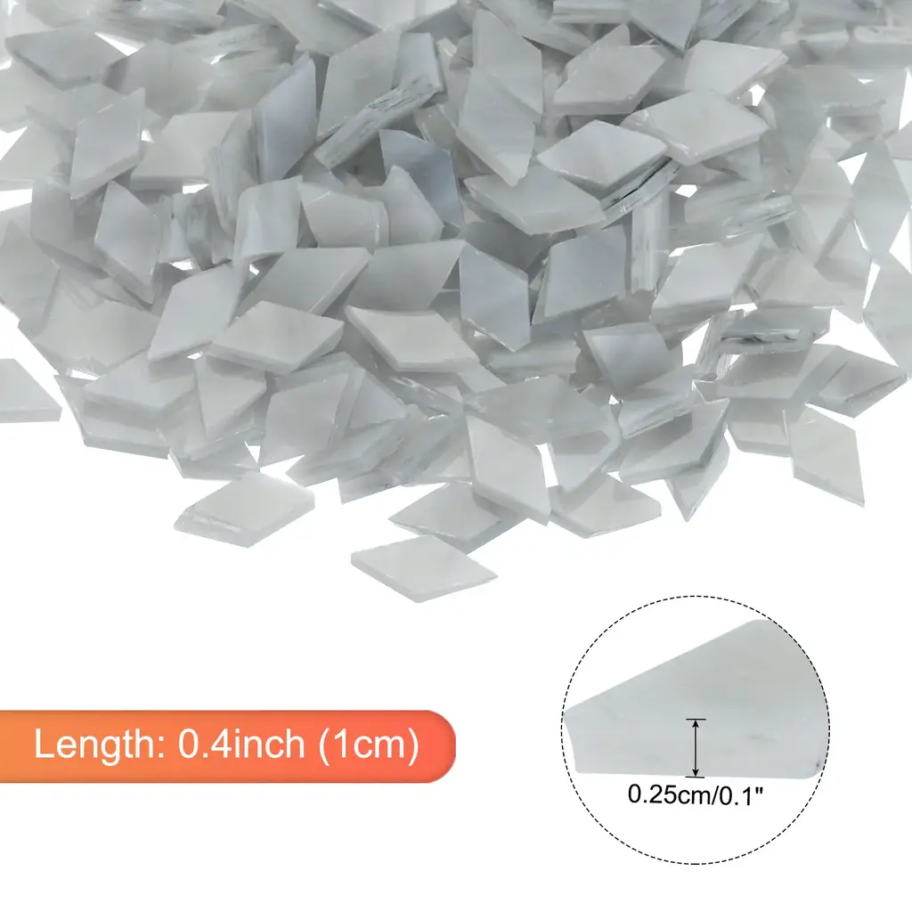 What is this?This crystal glass Mosaic bulk includes a variety of colors, as well as glass mosaics of different sizes, shapes, and processes, perfect for DIY projects such as coasters, picture frames, ceramic vases, garden decorations, TV walls, etc.What will I get?Color: White; Material: GlassWeight:200g/0.44 Pounds/7.05 OunceFinish Type: Crystal, Irregular Shape.Installation Type: Glue Down(Not Included Here!)In the Package of:Approx.130 pieces,200g mosaic rolled out area:approx.5.9x6.3in(15x16cm).Are there any advantages of the product?Durable and easy to clean:Mosaic tiles for craft are versatile and elegant, adding beauty to any DIY project. Their smooth surface makes them easy to clean and maintain, while their resistance to fading and moisture-proof makes them cost-effective and durable.How to use it?Prepare the surface by ensuring it's clean, dry, and flat. Apply suitable adhesive and press the mosaic tiles firmly in place. Leave the adhesive to dry for 24 hours before grouting the mosaic tiles. Finally, clean off any excess grout with a damp sponge.What should I notice?Wear protective gloves when handling mosaic tiles to prevent hurt from sharp edges. Avoid exposing the mosaic tiles to extreme temperatures, direct sunlight, or harsh chemicals. Follow the manufacturer's instructions carefully for optimal results.