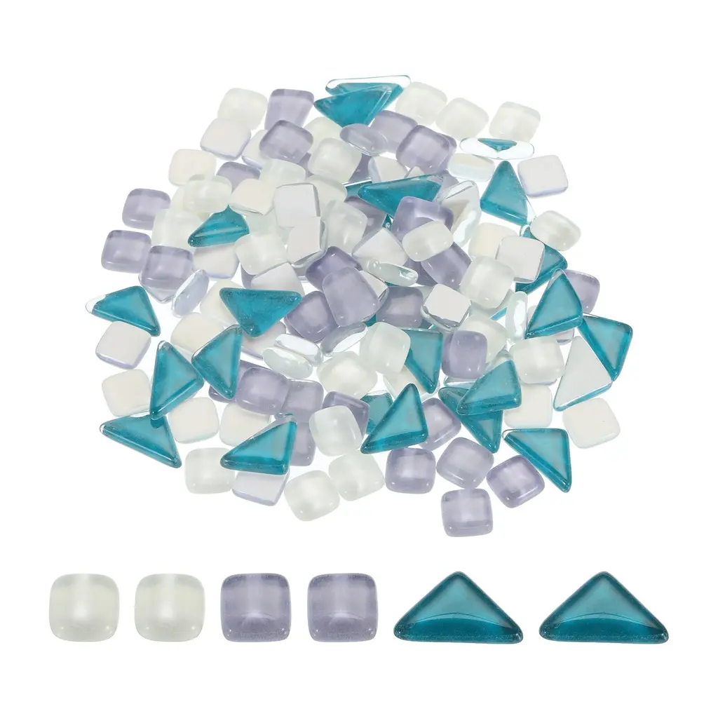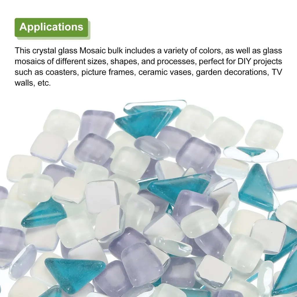 What is this?This crystal glass Mosaic bulk includes a variety of colors, as well as glass mosaics of different sizes, shapes, and processes, perfect for DIY projects such as coasters, picture frames, ceramic vases, garden decorations, TV walls, etc.What will I get?Color: Mint Green; Material: GlassWeight:200g/0.44 Pounds/7.05 OunceFinish Type: Crystal, Irregular Shape.Installation Type: Glue Down(Not Included Here!)In the Package of:Approx.130 pieces,200g mosaic rolled out area:approx.5.9x6.3in(15x16cm).Are there any advantages of the product?Durable and easy to clean:Mosaic tiles for craft are versatile and elegant, adding beauty to any DIY project. Their smooth surface makes them easy to clean and maintain, while their resistance to fading and moisture-proof makes them cost-effective and durable.How to use it?Prepare the surface by ensuring it's clean, dry, and flat. Apply suitable adhesive and press the mosaic tiles firmly in place. Leave the adhesive to dry for 24 hours before grouting the mosaic tiles. Finally, clean off any excess grout with a damp sponge.What should I notice?Wear protective gloves when handling mosaic tiles to prevent hurt from sharp edges. Avoid exposing the mosaic tiles to extreme temperatures, direct sunlight, or harsh chemicals. Follow the manufacturer's instructions carefully for optimal results.