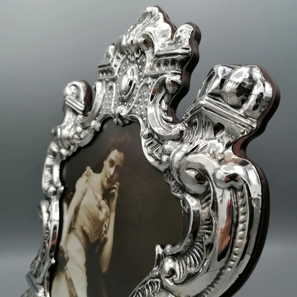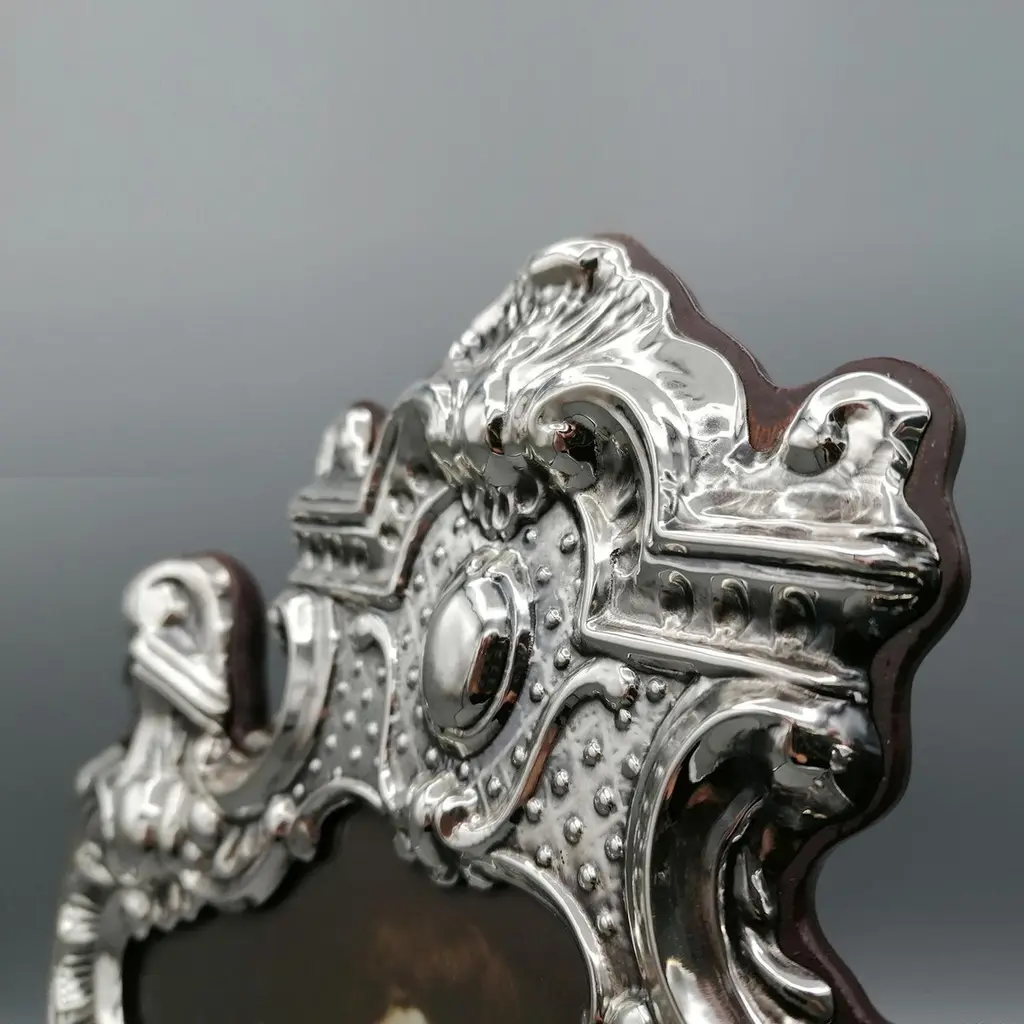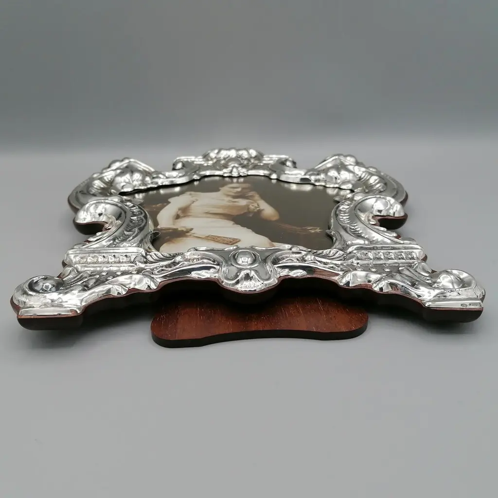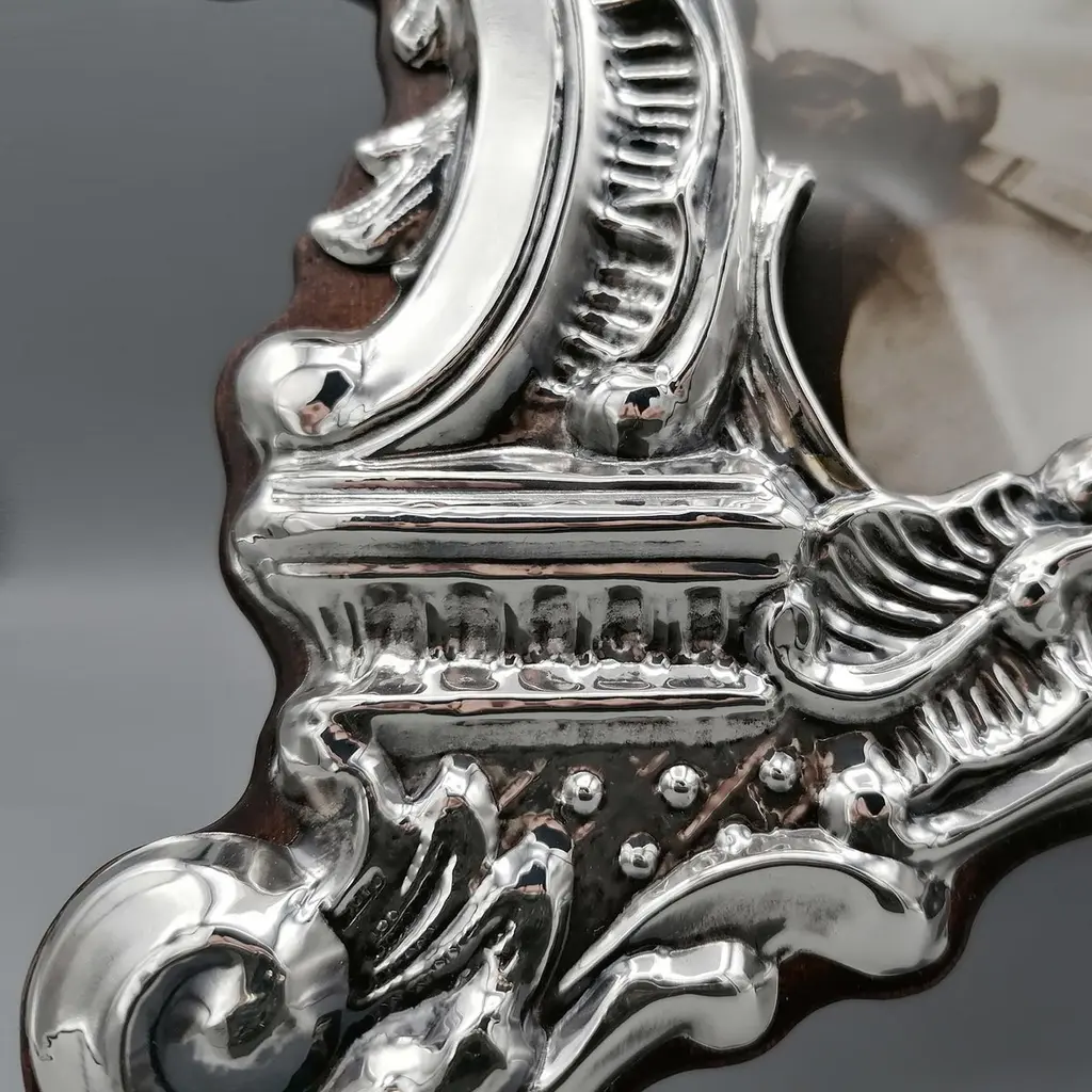Sterling silver frame in Baroque style called Cartagloria.The Cartagloria was used starting from the sixteenth century.The Cartegloria was placed on the altar, usually inside a wooden or silver frame, which shows some Latin formulas of the Roman Missal which are part of the ordinary of the Mass and therefore normally invariable.The Carteglorie were used by the priest to remind him of the formulas to be recited, particularly if the liturgy was at the moment that the book of the missal was at that moment far from the altar.Now back in fashion as a baroque photograph holder for our homes, the Cartagloria is suitable for prestigious houses in style, to be placed on an antique piece of furniture, or, less often, to be hung on the wall.The frame is shaped and decorated with scrolls typical of the Baroque period. In the upper part, in the center, there is a smooth coat of arms where we can engrave initials, noble coats of arms or other.In the silver plate the finish is shiny and burnished, to highlight the workmanship.The back is in solid hand-made wood that follows the shape of the silver embosse sheet positioned in the front of the object.The space for photography has a maximum width of cm. 24 and a minimum of 18 cmMade in Florence - ItalyItalian silverware, already with a centuries-old tradition, had a great development in the twentieth century and produced pieces of the highest quality that the whole world envies. Italian craftsmanship had a kind of new Renaissance after the war.A great many high-quality silverware was born where exceptional pieces were produced that now decorate the most prestigious houses.