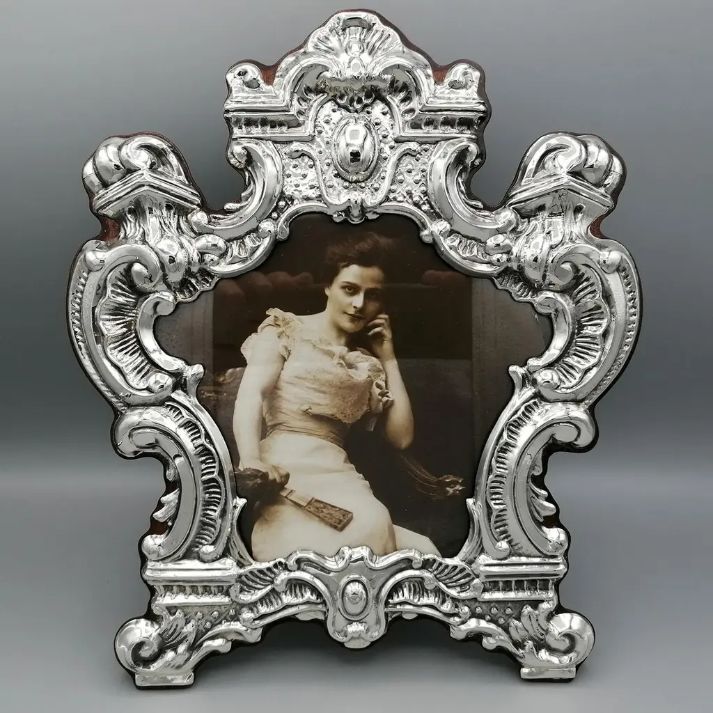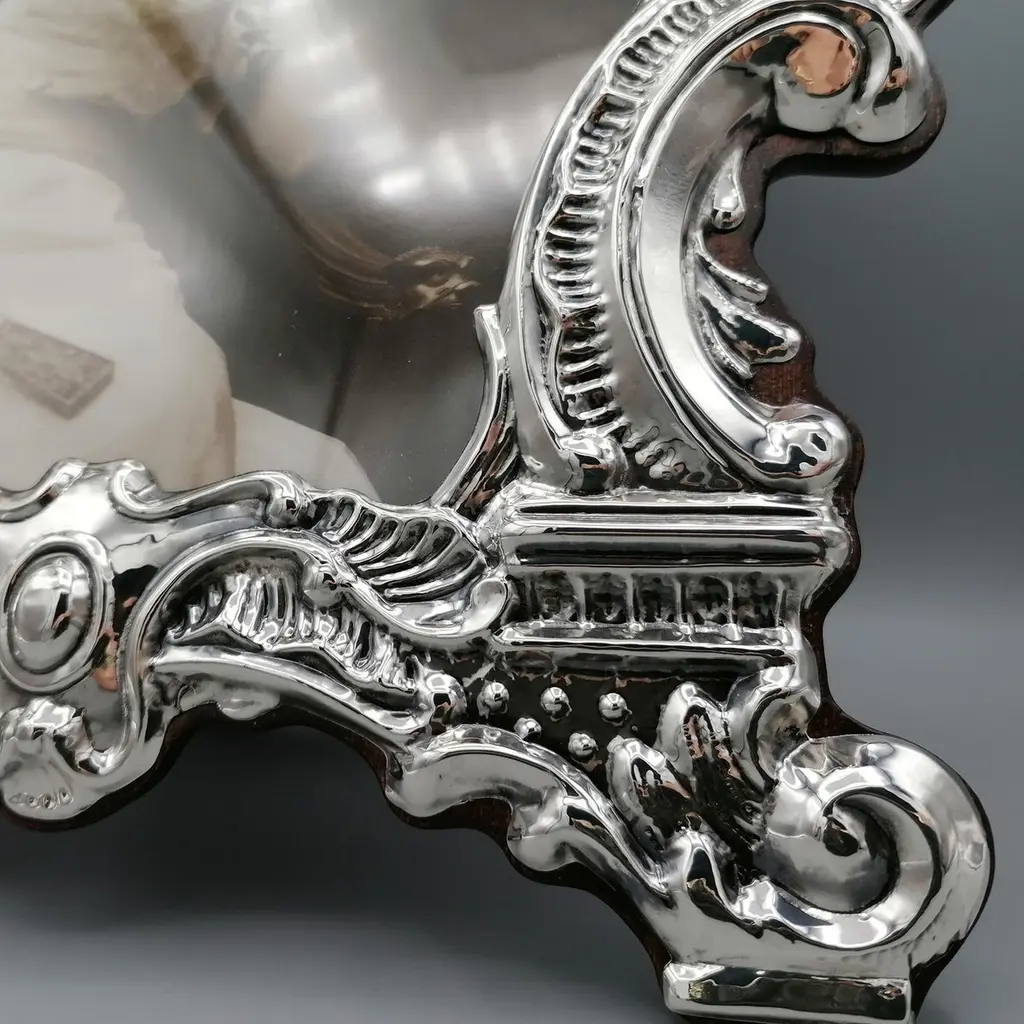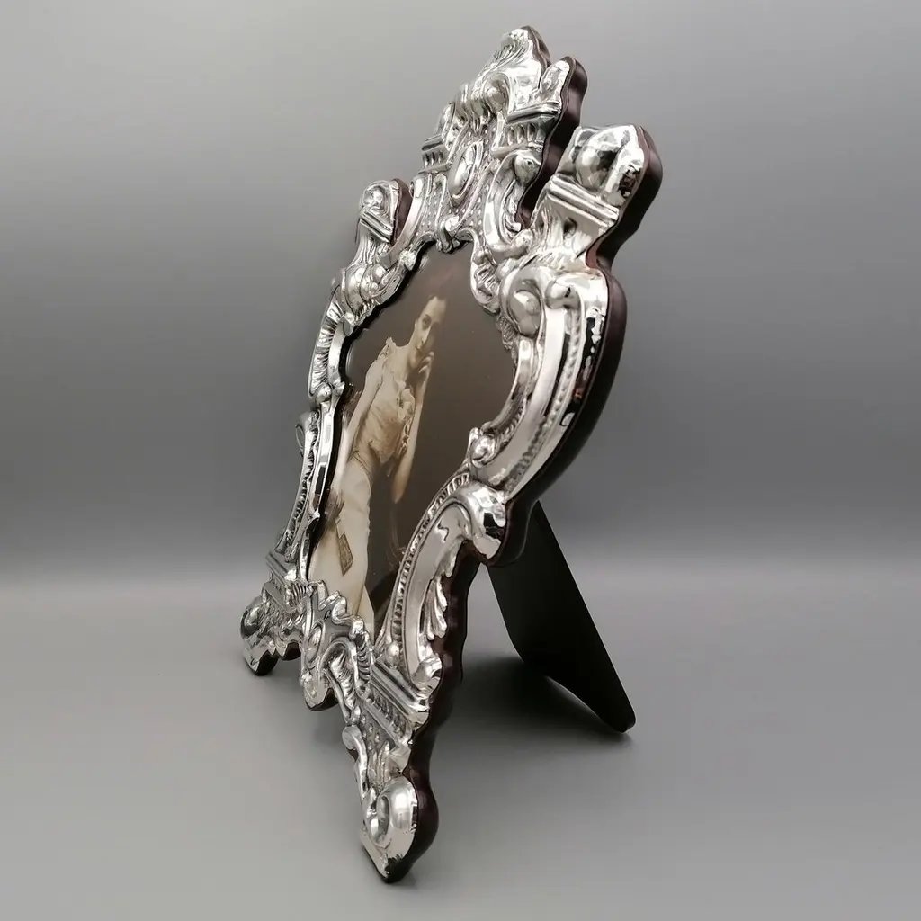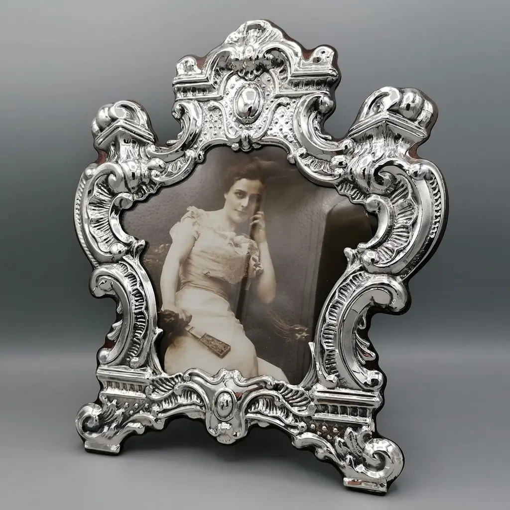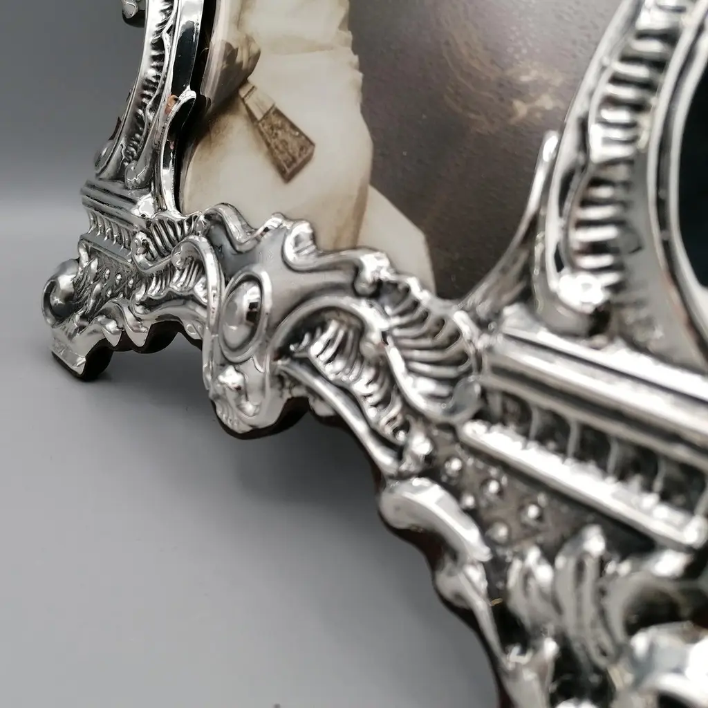 Sterling silver frame in Baroque style called Cartagloria.The Cartagloria was used starting from the sixteenth century.The Cartegloria was placed on the altar, usually inside a wooden or silver frame, which shows some Latin formulas of the Roman Missal which are part of the ordinary of the Mass and therefore normally invariable.The Carteglorie were used by the priest to remind him of the formulas to be recited, particularly if the liturgy was at the moment that the book of the missal was at that moment far from the altar.Now back in fashion as a baroque photograph holder for our homes, the Cartagloria is suitable for prestigious houses in style, to be placed on an antique piece of furniture, or, less often, to be hung on the wall.The frame is shaped and decorated with scrolls typical of the Baroque period. In the upper part, in the center, there is a smooth coat of arms where we can engrave initials, noble coats of arms or other.In the silver plate the finish is shiny and burnished, to highlight the workmanship.The back is in solid hand-made wood that follows the shape of the silver embosse sheet positioned in the front of the object.The space for photography has a maximum width of cm. 24 and a minimum of 18 cmMade in Florence - ItalyItalian silverware, already with a centuries-old tradition, had a great development in the twentieth century and produced pieces of the highest quality that the whole world envies. Italian craftsmanship had a kind of new Renaissance after the war.A great many high-quality silverware was born where exceptional pieces were produced that now decorate the most prestigious houses.