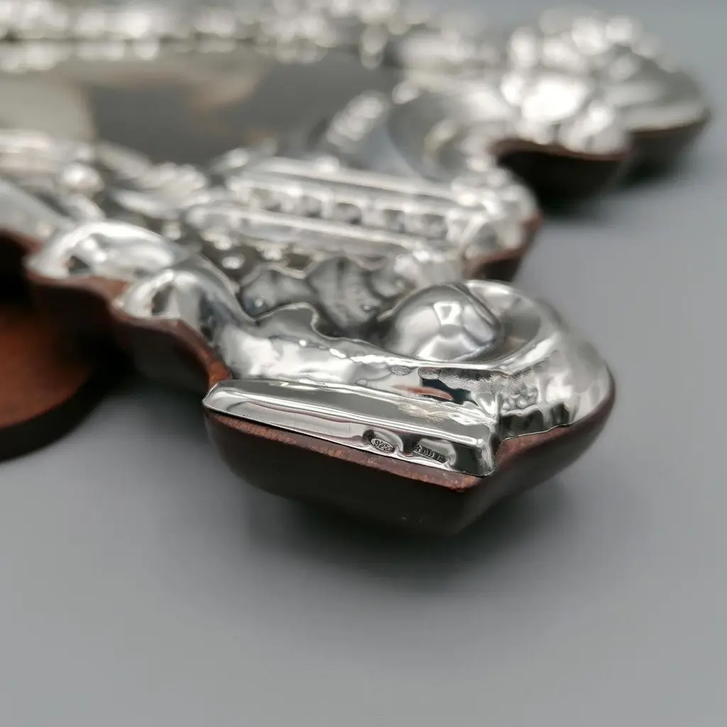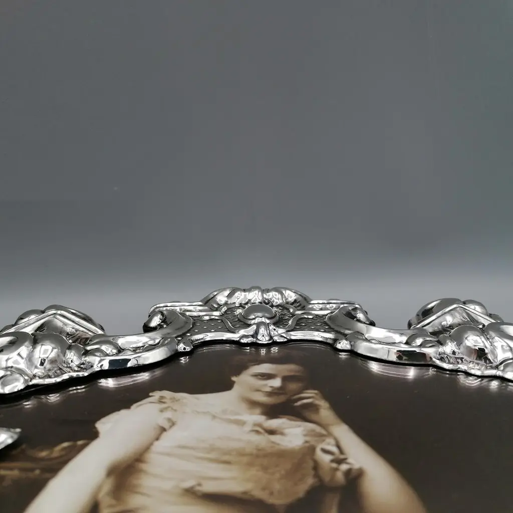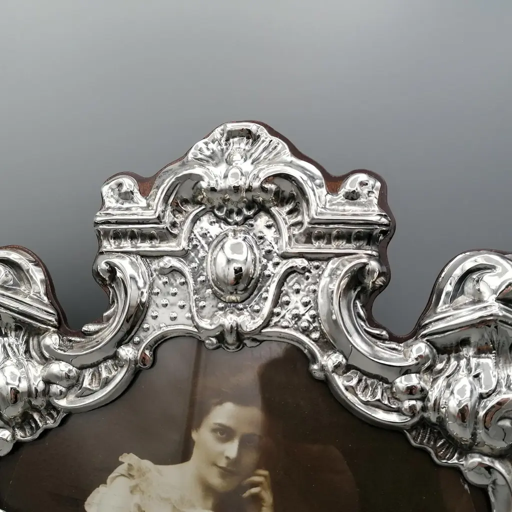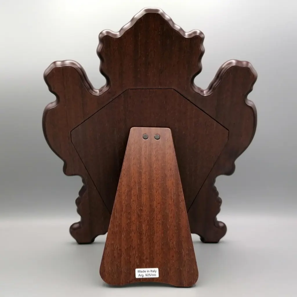Sterling silver frame in Baroque style called Cartagloria.The Cartagloria was used starting from the sixteenth century.The Cartegloria was placed on the altar, usually inside a wooden or silver frame, which shows some Latin formulas of the Roman Missal which are part of the ordinary of the Mass and therefore normally invariable.The Carteglorie were used by the priest to remind him of the formulas to be recited, particularly if the liturgy was at the moment that the book of the missal was at that moment far from the altar.Now back in fashion as a baroque photograph holder for our homes, the Cartagloria is suitable for prestigious houses in style, to be placed on an antique piece of furniture, or, less often, to be hung on the wall.The frame is shaped and decorated with scrolls typical of the Baroque period. In the upper part, in the center, there is a smooth coat of arms where we can engrave initials, noble coats of arms or other.In the silver plate the finish is shiny and burnished, to highlight the workmanship.The back is in solid hand-made wood that follows the shape of the silver embosse sheet positioned in the front of the object.The space for photography has a maximum width of cm. 24 and a minimum of 18 cmMade in Florence - ItalyItalian silverware, already with a centuries-old tradition, had a great development in the twentieth century and produced pieces of the highest quality that the whole world envies. Italian craftsmanship had a kind of new Renaissance after the war.A great many high-quality silverware was born where exceptional pieces were produced that now decorate the most prestigious houses.