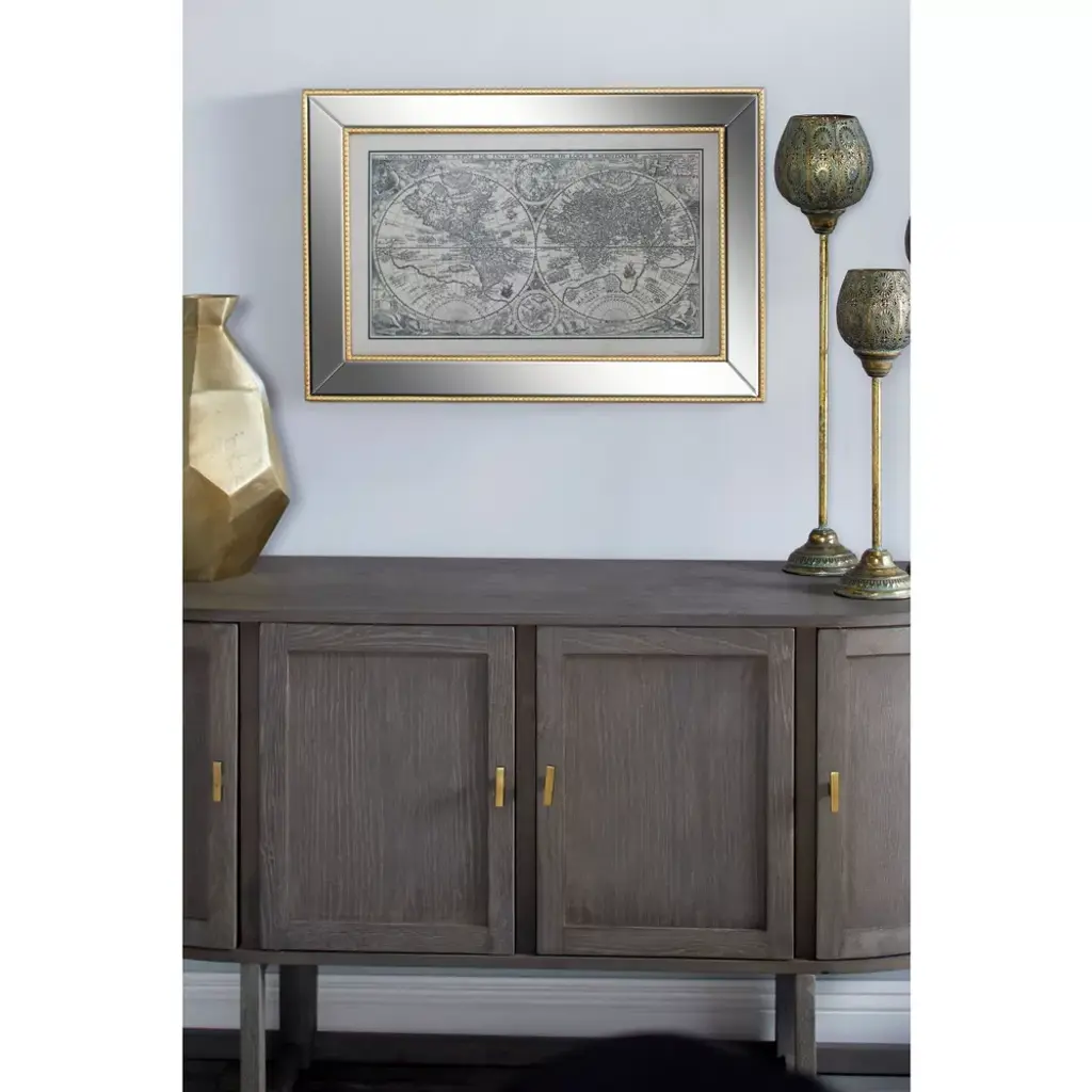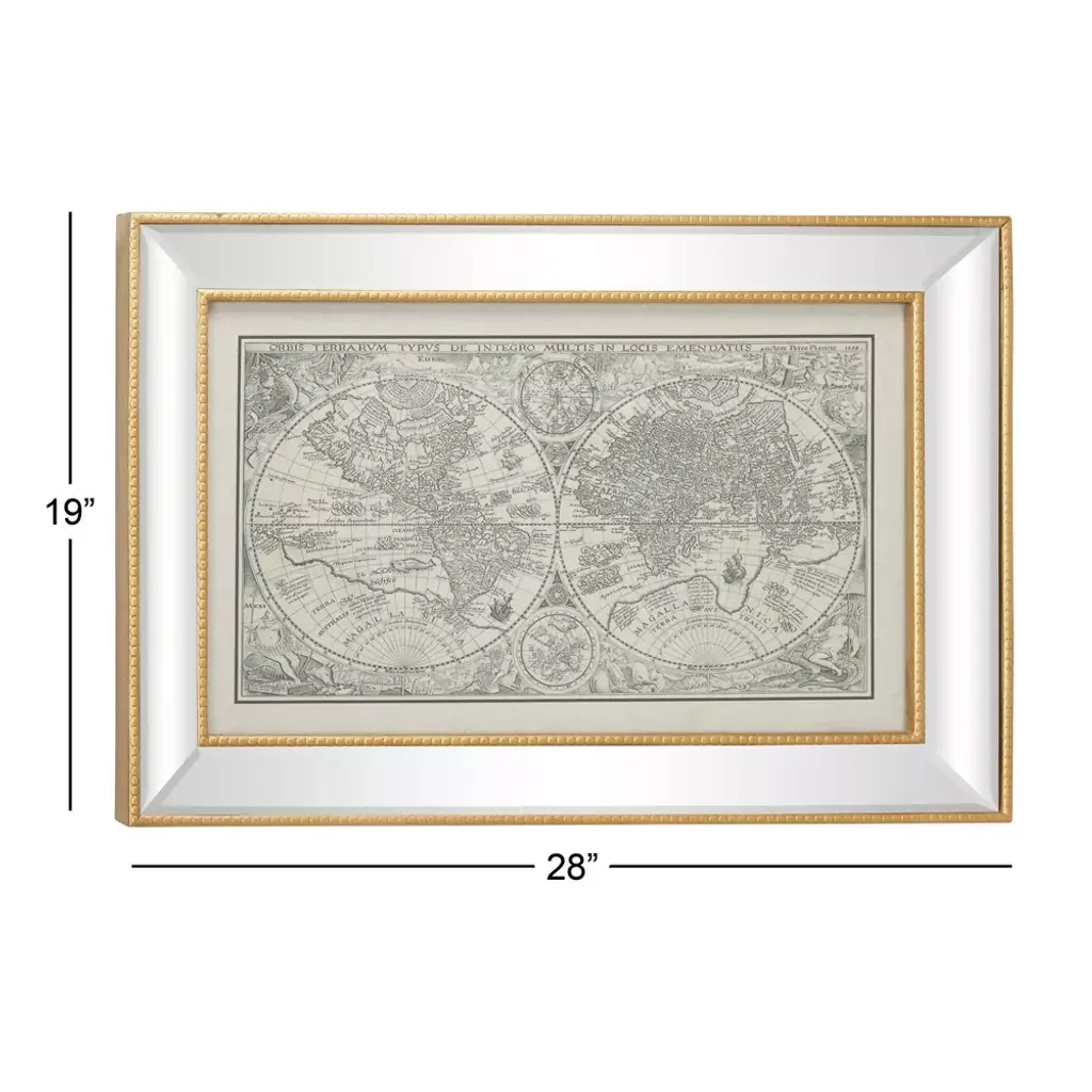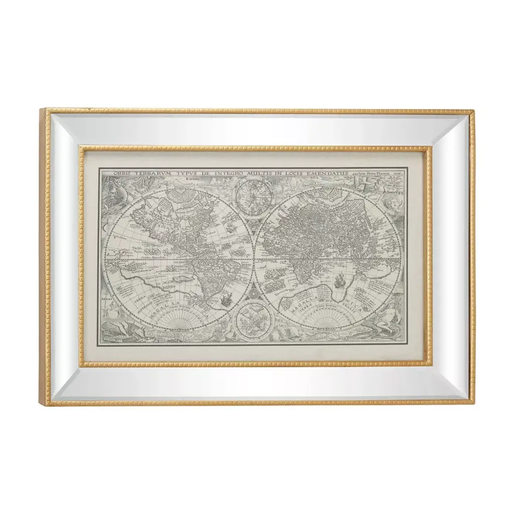Fine detail is given to this framed vintage world map illustration print by Petrus Plancius created in the 16th century… The print features an early depiction of the world, decorative borders, landscapes, and gods and goddesses, all laid out on a beige linen textile canvas. This large framed illustration is housed in a reflective mirror and gold wood frame.