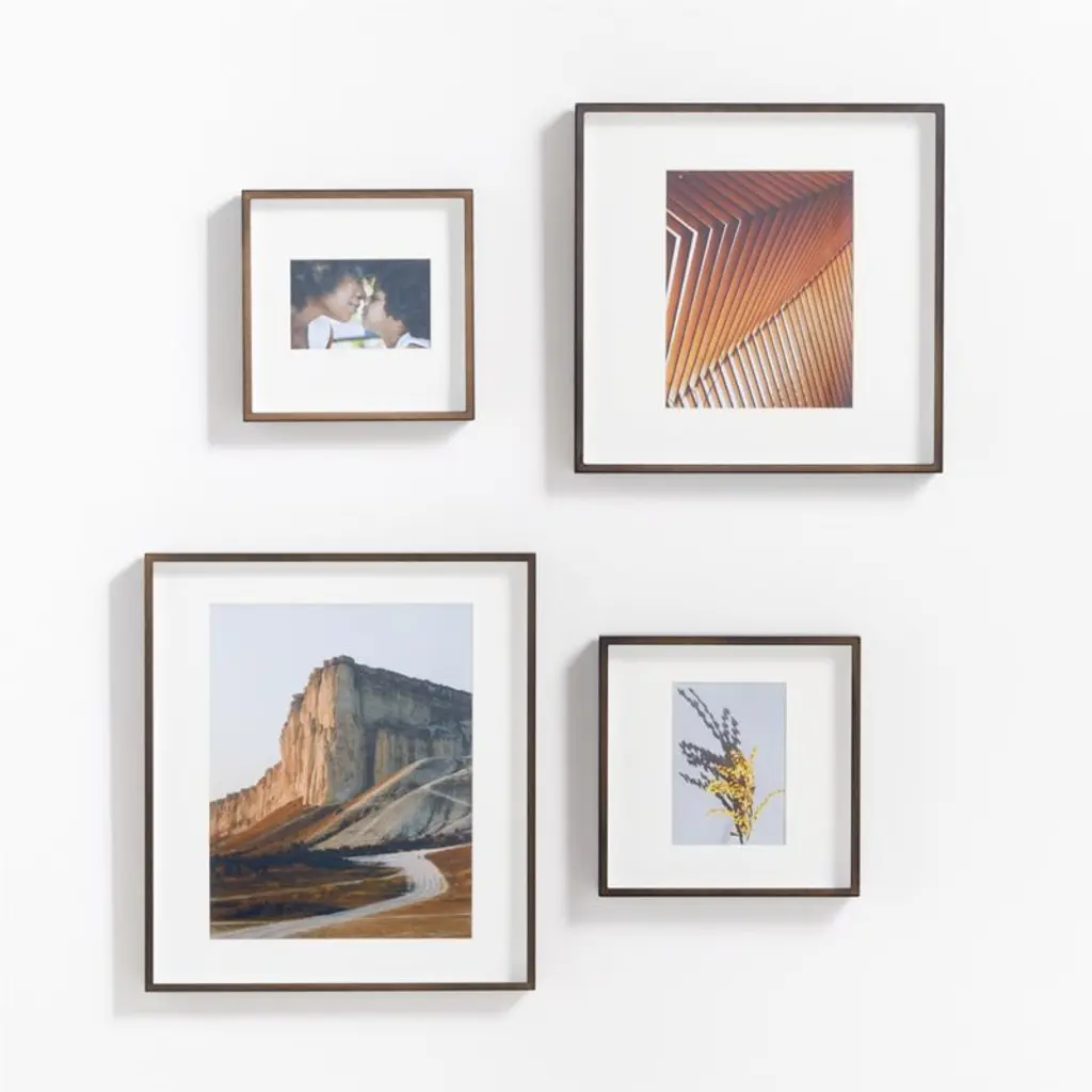 Create an instant gallery with this four-frame set. Our brushed antique bronze frames add drama to photo displays with their shadow-box styling and oversized off-white mats. A Crate & Barrel exclusive, the set unites 4"x6", 5"x7", 8"x10" and 11"x14" frames with a brushed antique bronze finish. Display the quartet in a grid, in a line down a hallway or arranged as a staggered gallery wall.