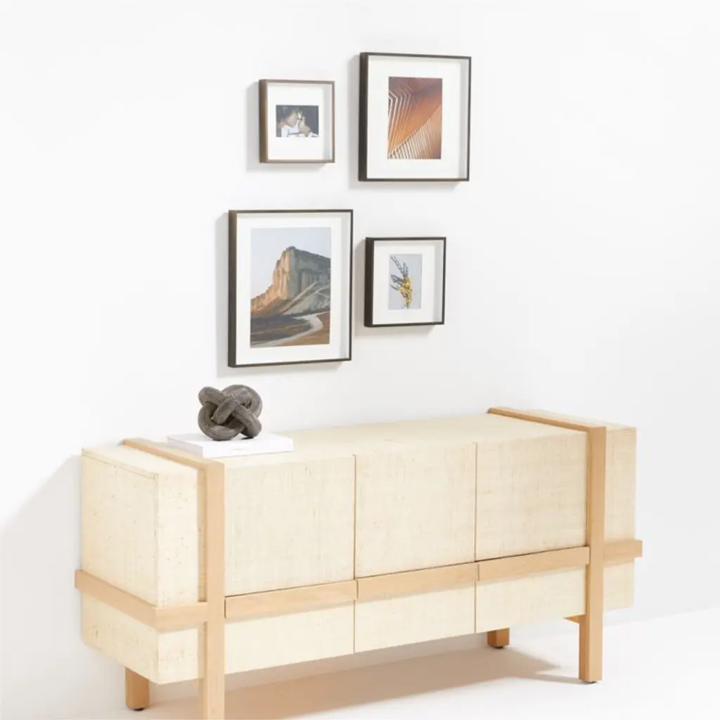 Create an instant gallery with this four-frame set. Our brushed antique bronze frames add drama to photo displays with their shadow-box styling and oversized off-white mats. A Crate & Barrel exclusive, the set unites 4"x6", 5"x7", 8"x10" and 11"x14" frames with a brushed antique bronze finish. Display the quartet in a grid, in a line down a hallway or arranged as a staggered gallery wall.