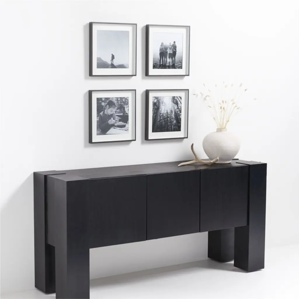 Create an instant gallery wall with this four-frame set. Our brushed black frames add dark drama to photo displays with their shadow-box styling and oversized off-white mats. A Crate & Barrel exclusive, the quartet of aluminum 11"x11" frames with a gunmetal finish can be displayed in a grid, in a line down a hallway or arranged as a staggered gallery wall.