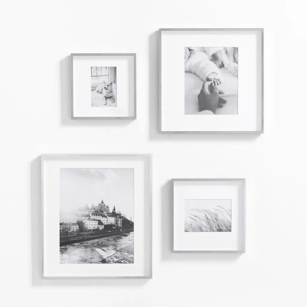 Create an instant gallery with this four-frame set. Our brushed silver frames add drama and shine to photo displays with their shadow-box styling and oversized off-white mats. A Crate & Barrel exclusive, the set unites 4"x6", 5"x7", 8"x10" and 11"x14" frames with a brushed silver finish. Display the quartet in a grid, in a line down a hallway or arranged as a staggered gallery wall.