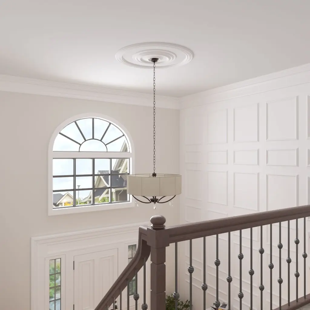 Ceiling rings are often used in conjunction with ceiling medallions in highlighting focal points like chandeliers and ceiling fans. However, ceiling rings can als be used on the wall to accent mirrors, photos and photo frames.•Sold as 1/4 of the complete circle - Must order a quantity of 4 to form a complete circle•Product needs to be trimmed and fitted together during installation to form a circle•Accent your ceilings with beautiful ceiling rings•Perfect addition to highlight ceiling medallions•Factory primed and ready for paint or faux finish•Can be cut, drilled, glued, or screwed•1/4 of complete circle