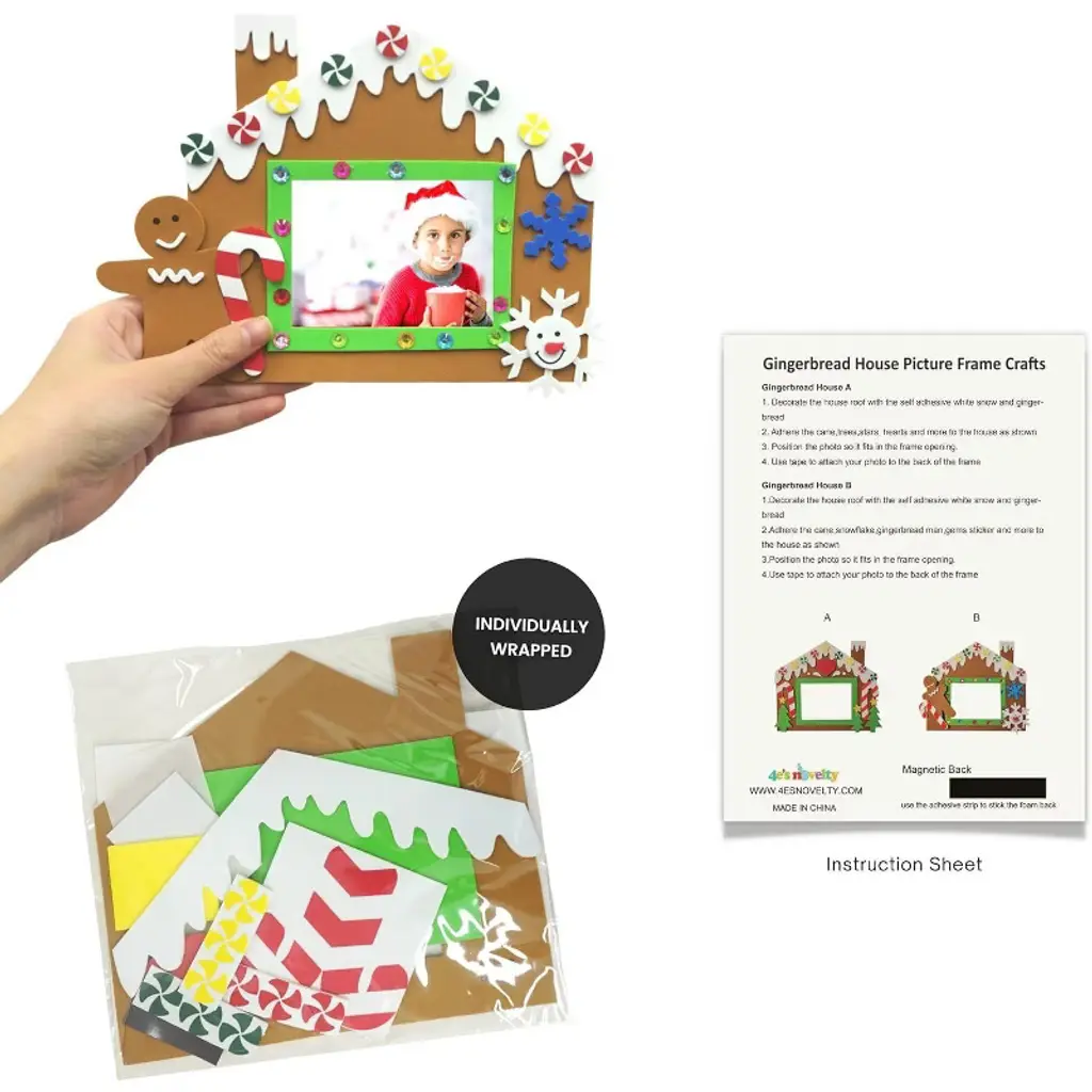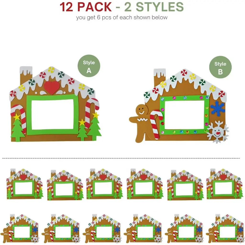 Looking for the perfect way to sprinkle some gingerbread magic into your holiday season? Well, look no further! Our gingerbread house picture frame craft is here to transform your holiday festivities into a gingerbread wonderland. With 12 foam frames, two adorable designs, and endless creative possibilities, this kit is the ultimate go-to for christmas picture frame craft fun. Whether you're looking to entertain the kiddos or whip up some DIY decorations, we've got you covered. These are not your average frames – oh no! With christmas photo ornament craft kits for kids, it's all about fun, foam, and flair. Each kit comes with everything you need to turn crafting time into a holiday masterpiece. Imagine the joy on your kids' faces as they peel and stick those cute little foam pieces to create their very own gingerbread ornaments. No glue, no mess, just sticky fun! And the best part? These frames fit perfectly on your fridge, thanks to their built-in magnets. So, let the creative chaos begin! STICK AND SMILE!: No need for sticky fingers this holiday season. Our foam picture frames for crafts christmas feature self-adhesive foam pieces that make crafting a breeze. Kids of all ages can easily assemble their frames with minimal supervision. Say goodbye to the frustration of glue and hello to the joy of instant sticking. Whether it's gingerbread christmas decorations or christmas frame crafts for kids, this kit makes it easy to get into the holiday spirit! CRAFTY KEEPSAKES!: Get ready for the ultimate DIY experience with our diy christmas photo ornament kit. Perfect for capturing holiday memories, these frames are designed to hold a 3x4 photo of your choosing. Not only do they make for festive fridge décor, but they also double as christmas ornament crafts for kids with photo! Pop a picture in the frame, and you've got a personalized gift or keepsake to treasure for years to come. FROM TODDLERS TO TEENS!: Whether you're entertaining toddlers or hosting a Christmas crafting party, our foam christmas frames for kids crafts bulk have got you covered. With 12 frames – 6 of each design – there's plenty to go around. The gingerbread kits for kids are perfect for group activities, whether it's a classroom, Sunday school, or daycare. Plus, the frames come individually wrapped, making them ideal for holiday gift exchanges or stocking stuffers. GINGERBREAD MAGIC!: This isn't just about arts and crafts; it's about creating lasting memories. Our gingerbread ornament kit adds a dash of magic to the holiday season. Watch your kids light up as they create their own diy christmas ornaments for kids photo to hang proudly around the house. These christmas foam picture frames are more than just decorations; they’re tiny frames filled with joy, creativity, and a whole lot of gingerbread charm. The holiday season is all about coming together, and what better way to bond than with a good ol' christmas picture craft? Let your little elves take charge as they craft their way through the holidays, making their own gingerbread house picture frame craft. With each frame holding a treasured memory, it's more than just an activity – it’s a keepsake they'll cherish. From gingerbread christmas decorations to christmas foam photo frames for kids, this kit has everything needed to make the season extra special. Ready to get crafting? This holiday season, give the gift of creativity and fun with our christmas frame crafts for kids. It’s not just a craft – it’s a holiday tradition waiting to happen!