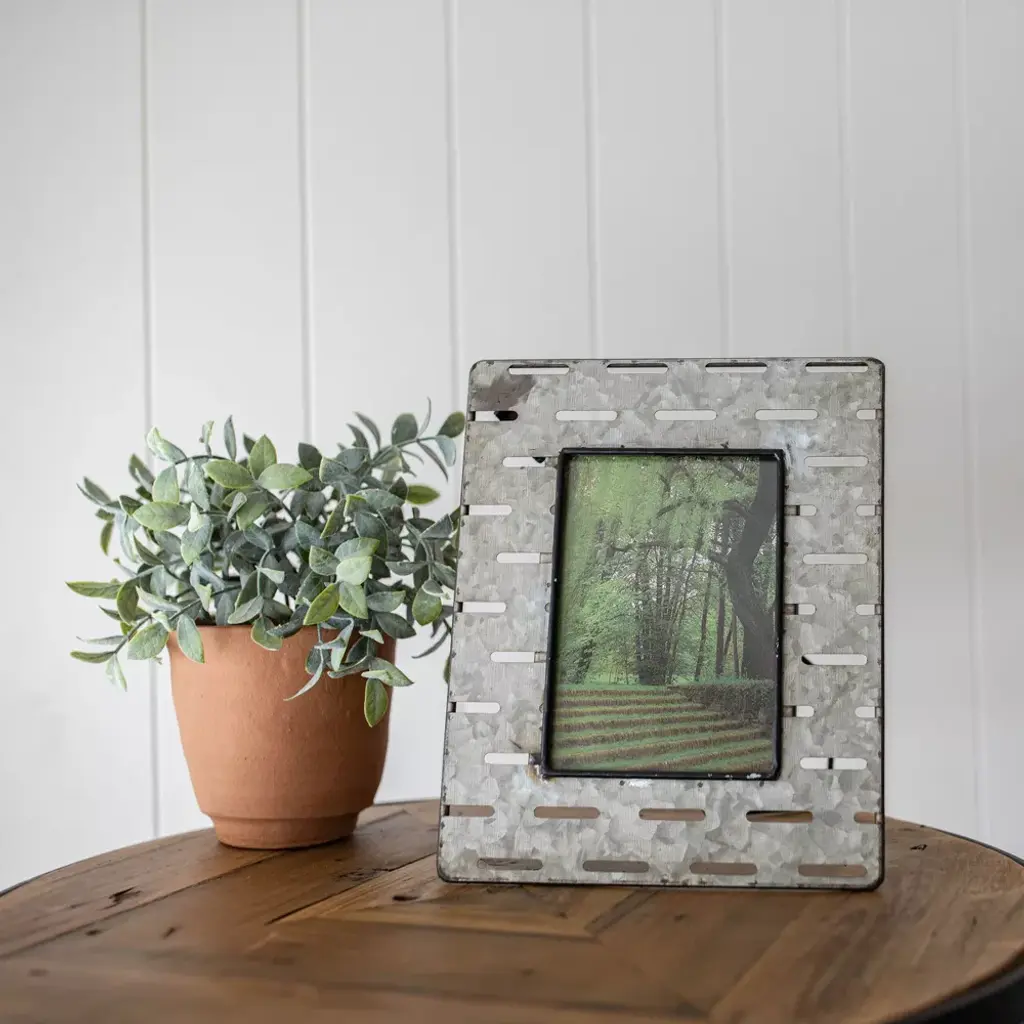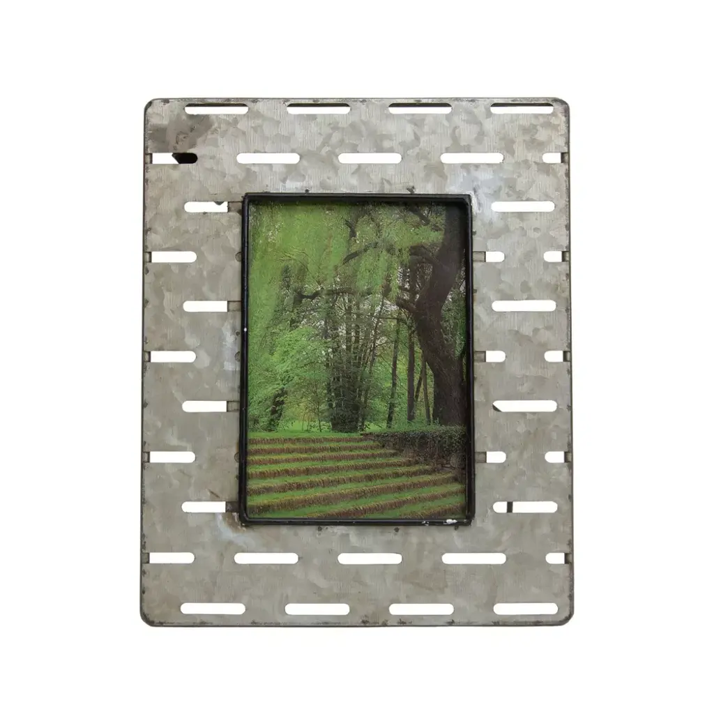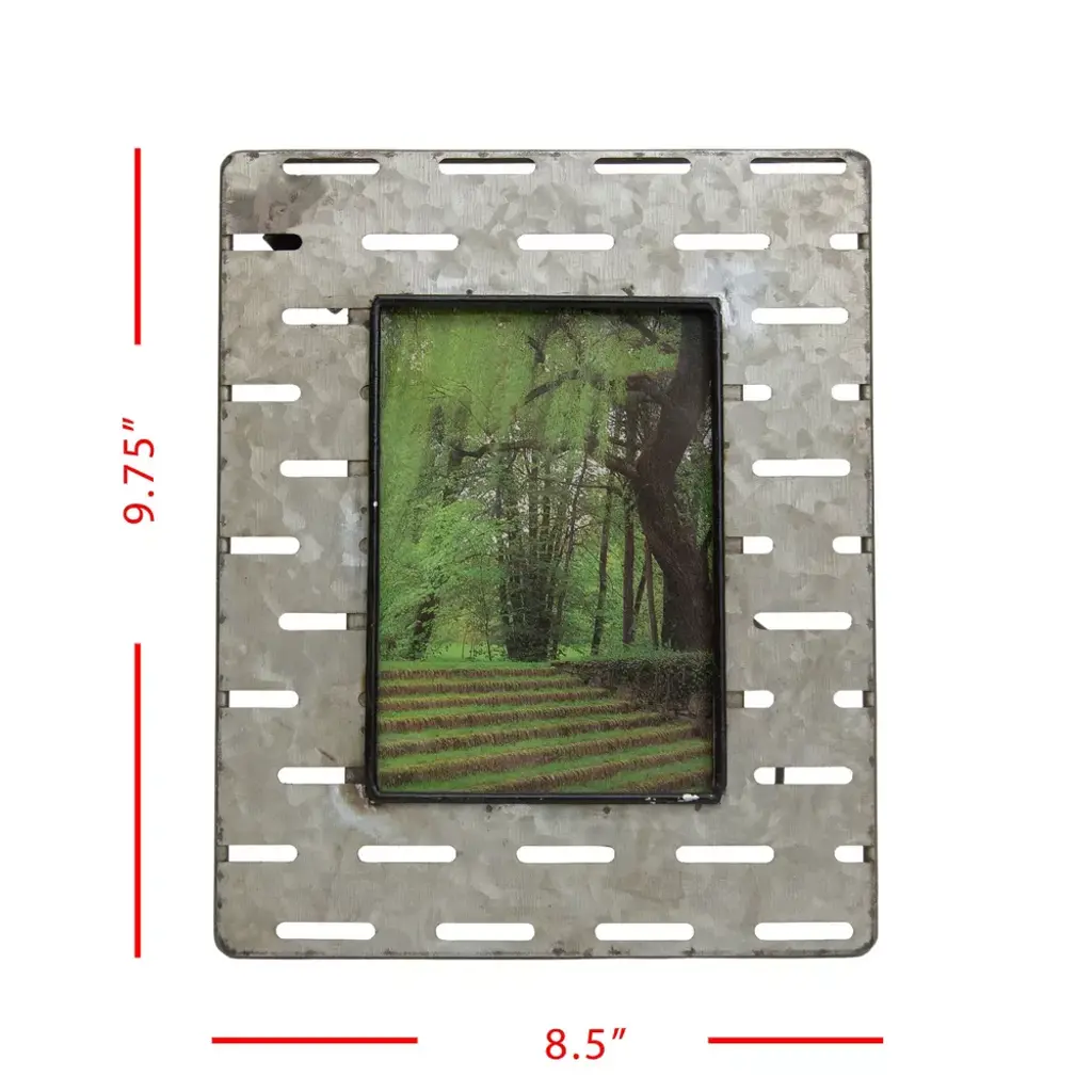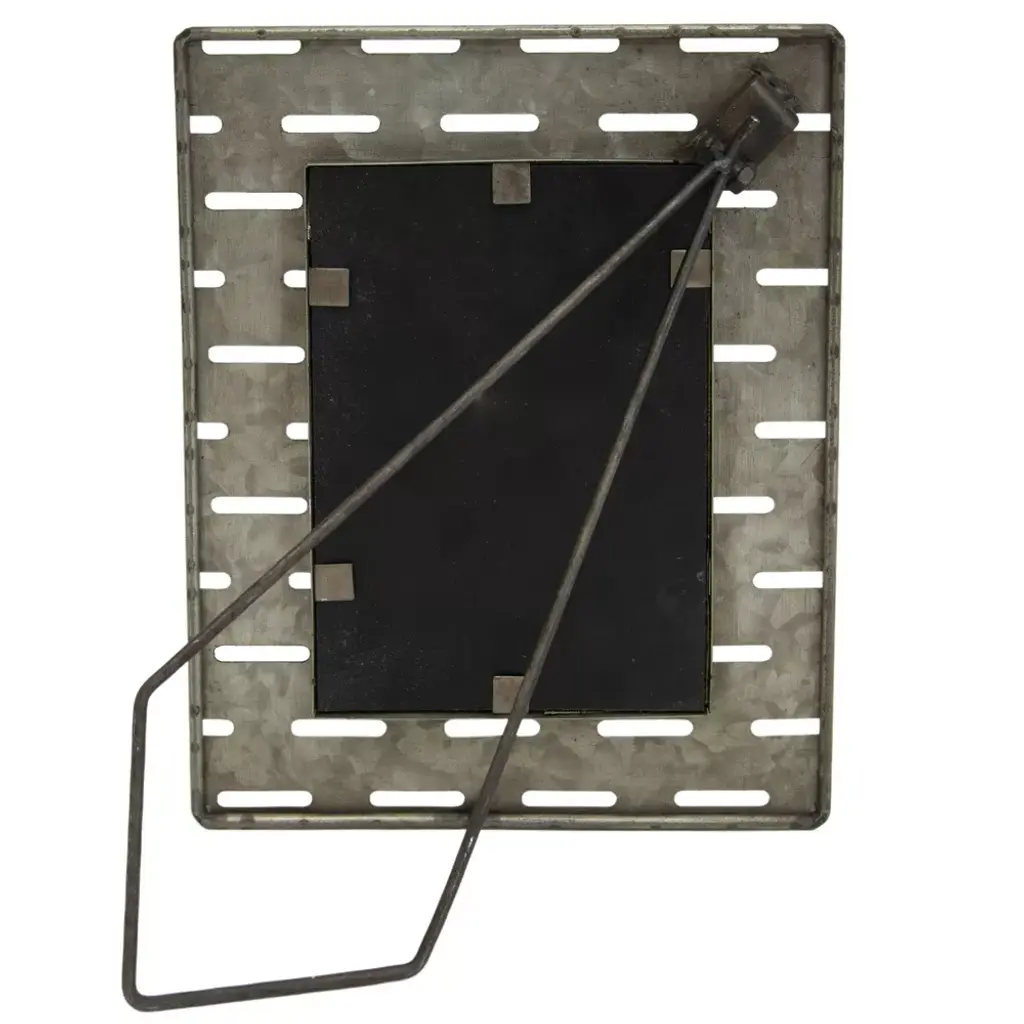 Display your precious memories in style with this 4x6 picture frame from Foreside Home & Garden. This lovely frame features a trendy olive bucket style pattern cut out of galvanized metal. Its black edging around the frame opening adds to its charm and adds an updated element to a traditional farm motif.