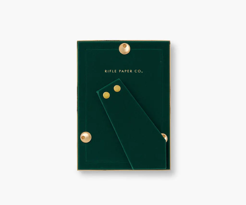 In a floral frame of mind. This Hydrangea illustrated picture frame features gold accents and an evergreen velvet backing with a kickstand for display. The frame holds a standard 4x6 photo.