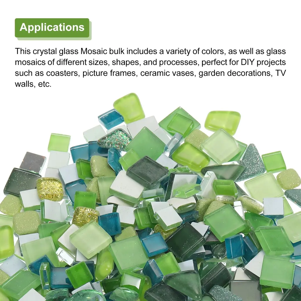 What is this?This crystal glass Mosaic bulk includes a variety of colors, as well as glass mosaics of different sizes, shapes, and processes, perfect for DIY projects such as coasters, picture frames, ceramic vases, garden decorations, TV walls, etc.What will I get?Color: Green Series; Material: GlassWeight:500g/1.1 pounds/17.6 OunceFinish Type: Polished/Glitter/Mirror Surface/Irregular shape.Installation Type: Glue Down(Not Included Here!)Size(LWH) : Square shape 1 cm x 1 cm x 0.4 cm/0.39" x 0.39" x 0.16" or 1.5 cm x 1.5 cm x 0.4 cm/0.6" x 0.6" x 0.16"; Irregular shape and circle.Are there any advantages of the product?Durable and easy to clean:Mosaic tiles for craft are versatile and elegant, adding beauty to any DIY project. Their smooth surface makes them easy to clean and maintain, while their resistance to fading and moisture-proof makes them cost-effective and durable.How to use it?Prepare the surface by ensuring it's clean, dry, and flat. Apply suitable adhesive and press the mosaic tiles firmly in place. Leave the adhesive to dry for 24 hours before grouting the mosaic tiles. Finally, clean off any excess grout with a damp sponge.What should I notice?Wear protective gloves when handling mosaic tiles to prevent hurt from sharp edges. Avoid exposing the mosaic tiles to extreme temperatures, direct sunlight, or harsh chemicals. Follow the manufacturer's instructions carefully for optimal results.