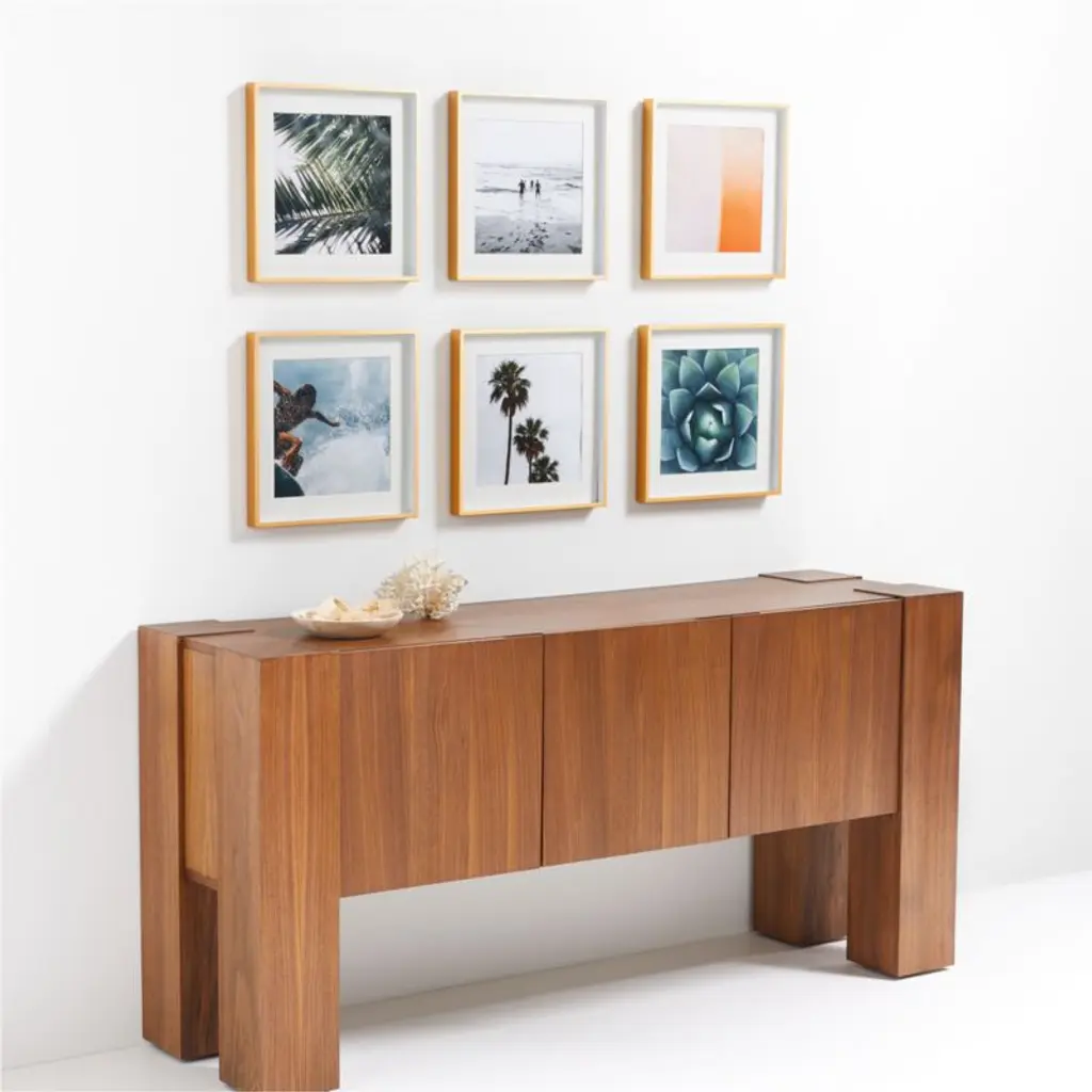 Create an instant gallery wall with this six-frame set. Our brushed brass frames add gleaming drama to photo displays with their shadow-box styling and oversized off-white mats. A Crate & Barrel exclusive, the sextet of aluminum 11"x11" frames with a brushed brass finish can be displayed in a grid, in a long line down a hallway or arranged as a staggered gallery wall.