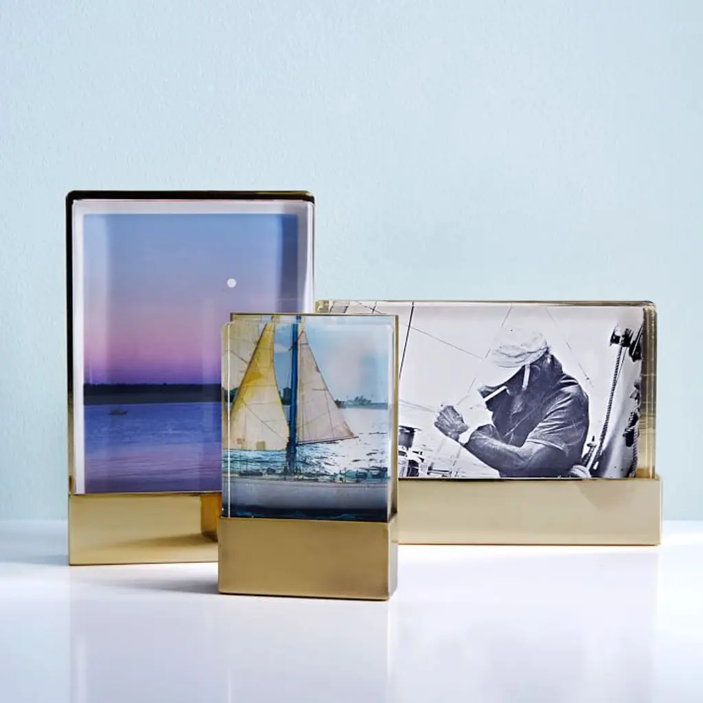 Acrylic front. Metal base in Gold finish. Free standing. Imported.