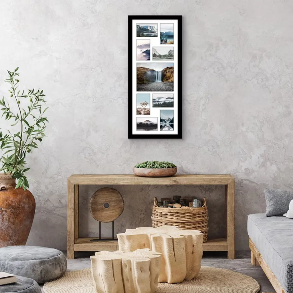 Enhance your home decor with the Americanflat 12x30 collage picture frame. Crafted with attention to detail, this picture frame features a timeless design with an engineered wood (MDF) molding. It's tailored to beautifully display your treasured moments, offering a custom white mat with versatile openings for various photo sizes, fitting one 8x10 and eight 4x6 pictures or one 12x30 picture with no mat. Equipped with hanging hardware, it offers effortless vertical or horizontal wall mounting, allowing you to effortlessly curate your own gallery wall. Its gallery style design seamlessly integrates into any decor, adding a sophisticated touch to your interior. Beyond aesthetics, these frames ensures premium protection for your photos, boasting a polished plexiglass front to guard against dust and scratches. With a sturdy backboard and easy turn buttons, loading and updating photos is a simple task. Choose Americanflat for superior craftsmanship and secure packaging, ensuring your gallery frame set arrives in immaculate condition, ready to showcase your memories for years to come.