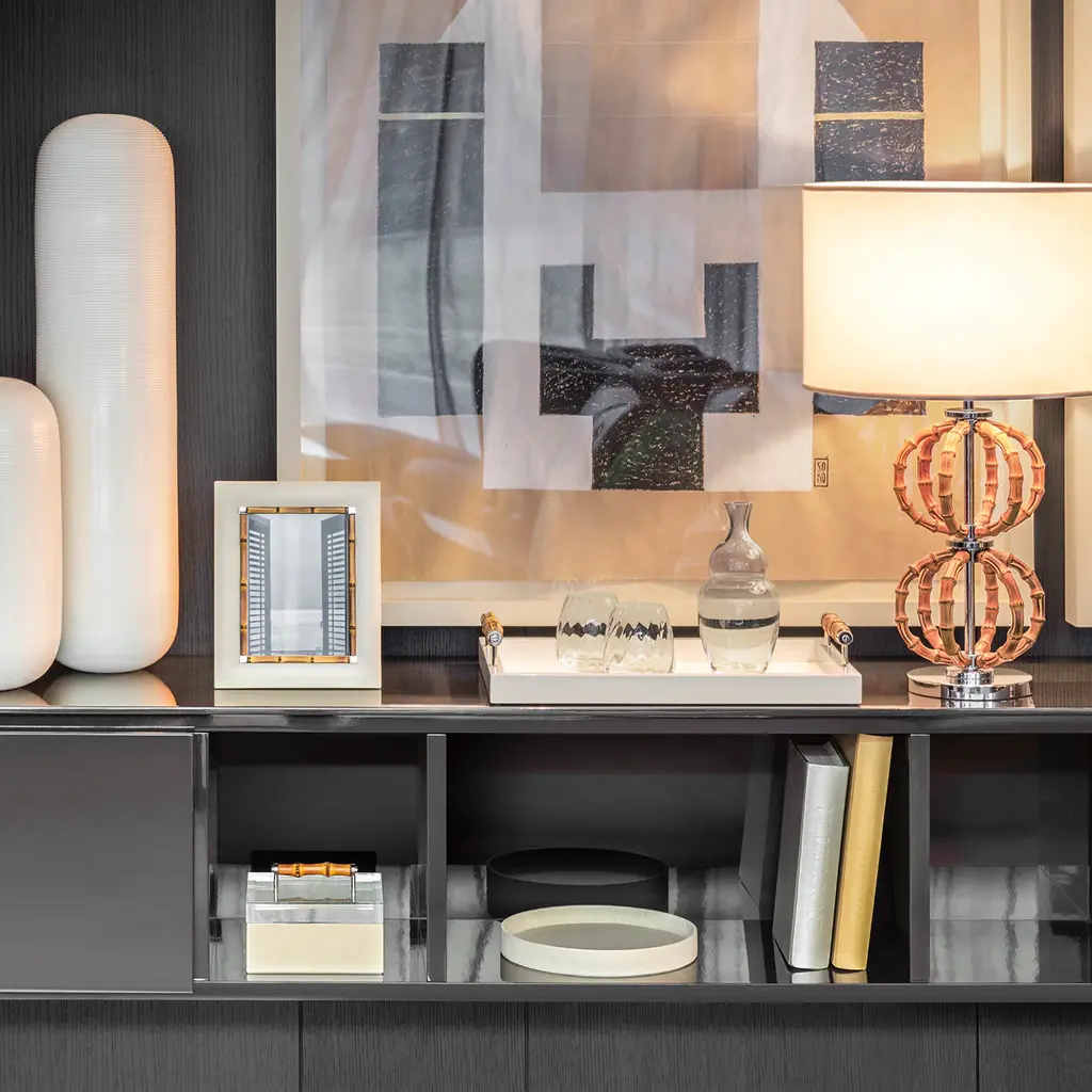 Quilted leather frame with bamboo trim and chrome metal details. A precious small object made with the utmost care for every detail. Bice picture frame is a perfect way to display treasured memories and make a thoughtful gift too. Picture size cm 13 x 18.