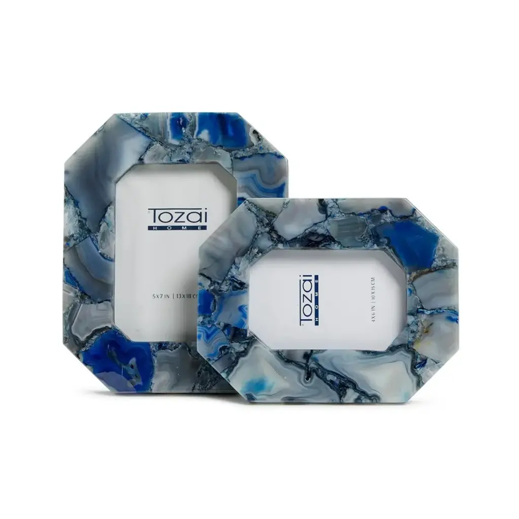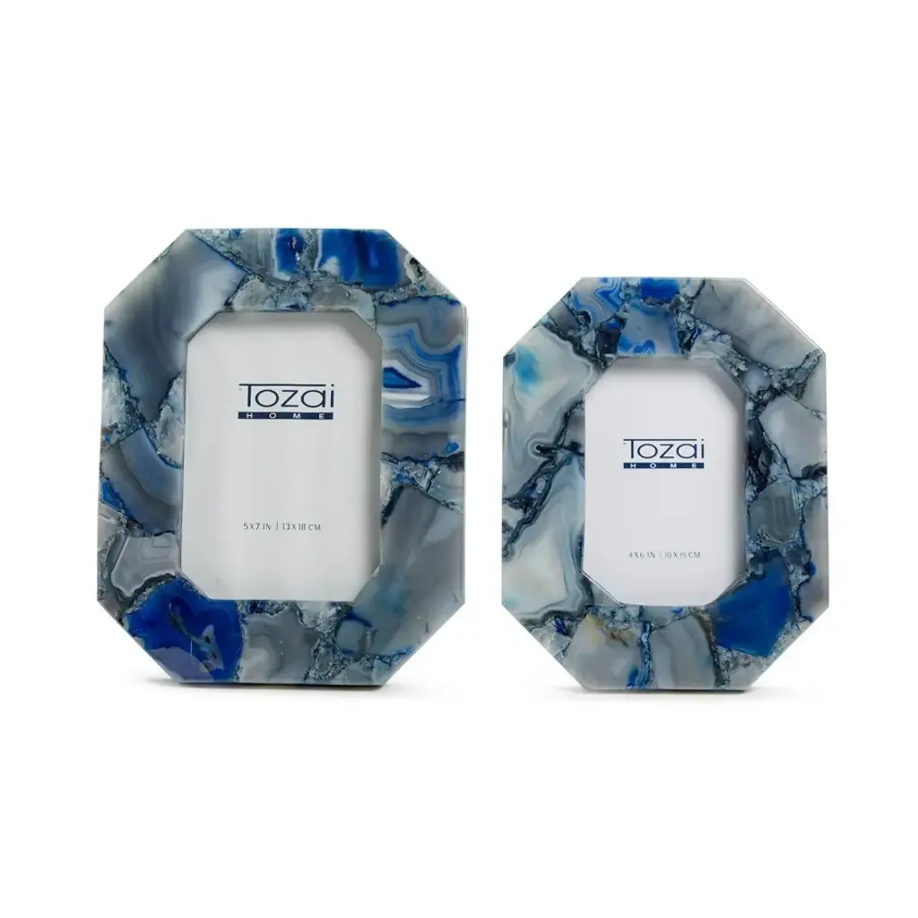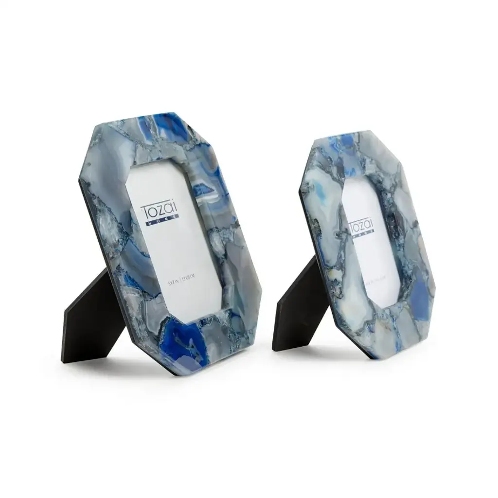 Elevate your cherished memories with this stunning blue agate set of 2 octagon photo frames. Crafted from genuine agate, each frame is a unique work of art that exudes luxury and sophistication. The natural color variations and fissures add an organic touch to your decor. The set includes two sizes, 4" x 6" and 5" x 7", allowing for versatile display options either horizontally or vertically.