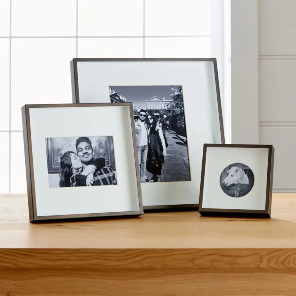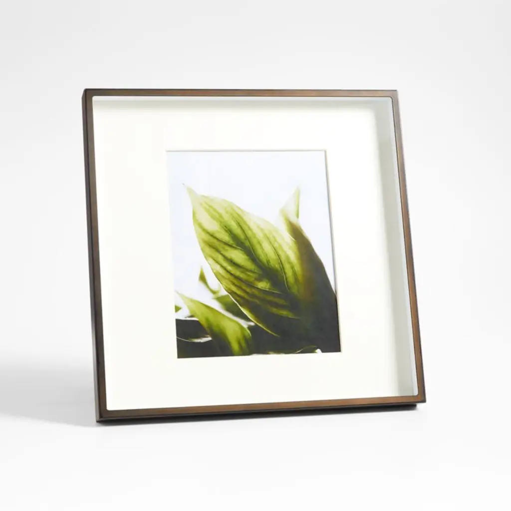 Our brushed antique bronze frame adds drama to photo displays with its shadow-box styling and oversized off-white mat. Our square 8x10 frame, a Crate and Barrel exclusive, can be displayed on the wall or tabletop.
