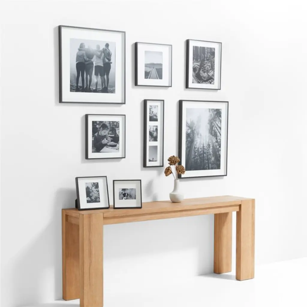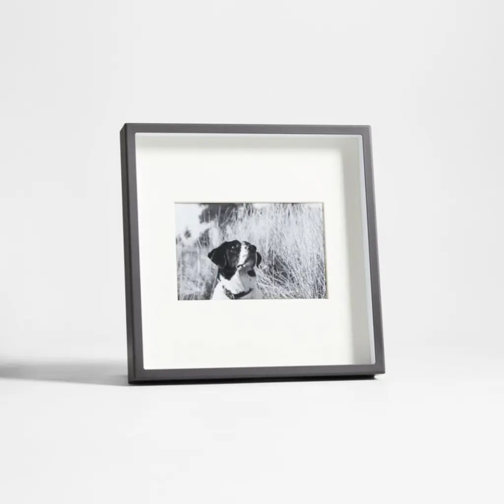 Our brushed black frames add dark drama to photo and print displays with their shadow-box styling and oversized off-white mats. A Crate & Barrel exclusive, our aluminum frames with a brushed black finish can be displayed on a mantel, bookshelf or table.