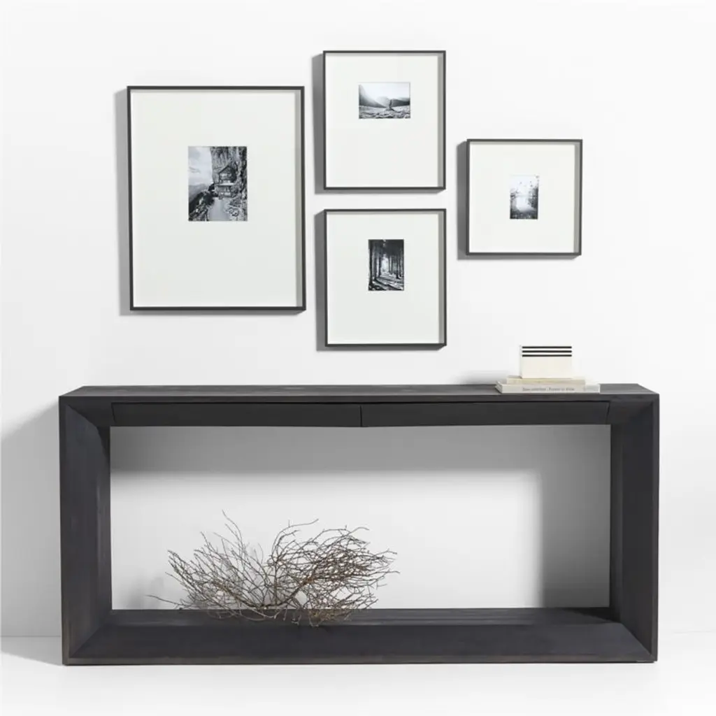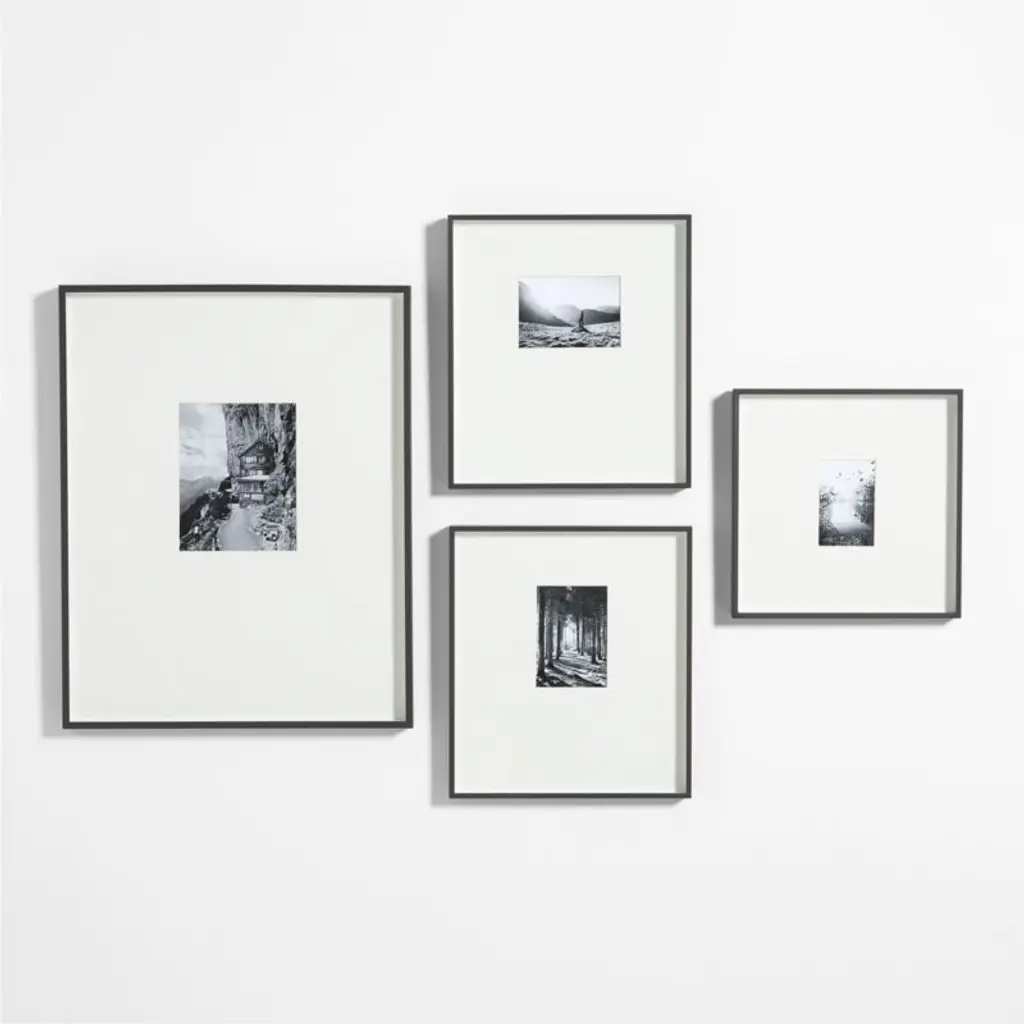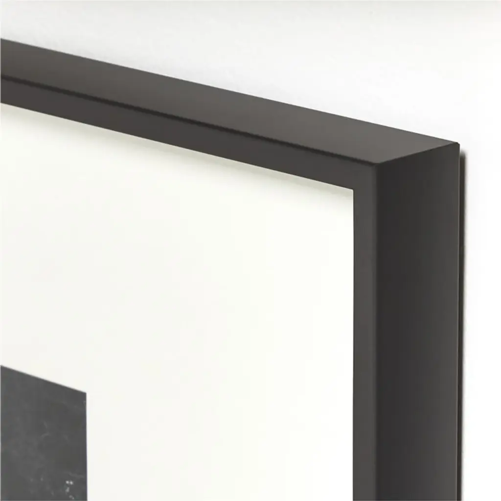 Our brushed black frame adds dark drama to photo and print displays with shadow-box styling and generous offset mat. This vertical frame presents a 5"x7" vertical photo just above center in a wide-margin mat for an elevated, gallery-like look. A Crate & Barrel exclusive, our aluminum frame with brushed black finish is designed to be displayed on the wall.