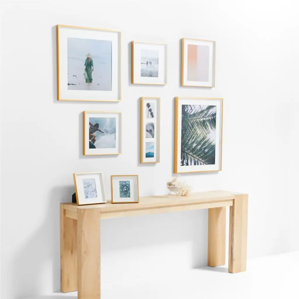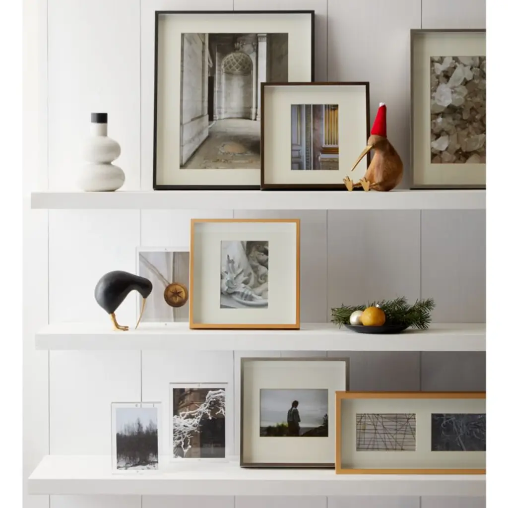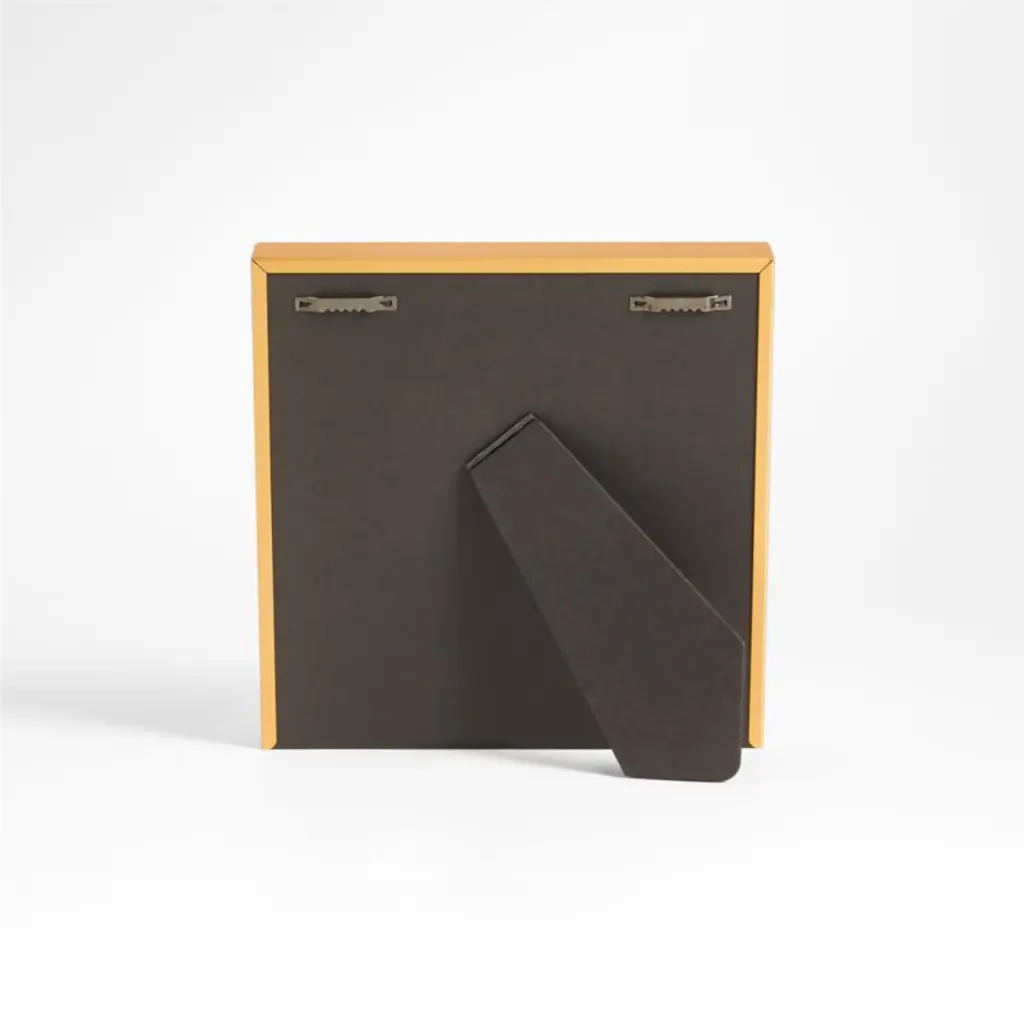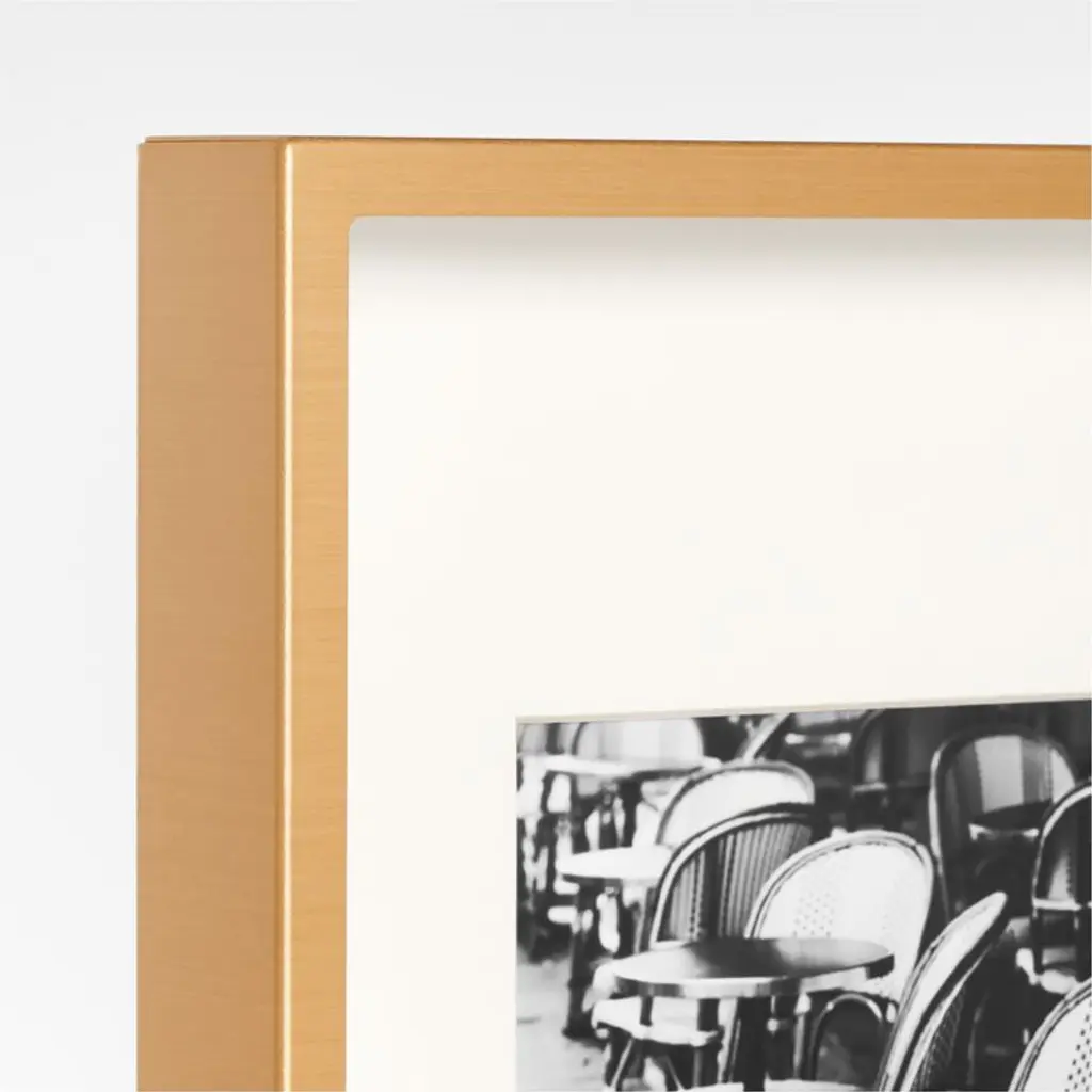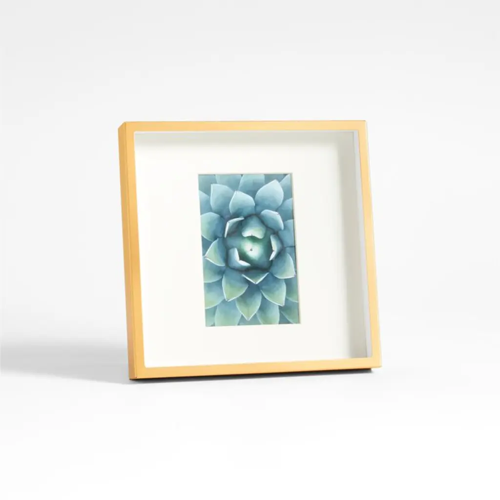 Our brushed brass frame adds gleaming drama to photo displays with its shadow-box styling and oversized off-white mat. The square frame sets off rectangular photos for a unique silhouette. A Crate & Barrel exclusive, our aluminum 4x6 frame with a brushed brass finish can be displayed on a mantel, bookshelf or wall.