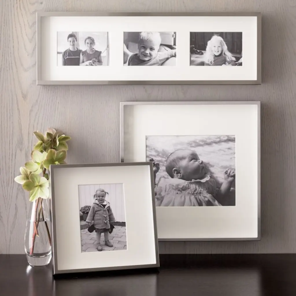 Our brushed silver square frame adds drama and shine to photo displays with its shadow-box styling and oversized off-white mat. A Crate & Barrel exclusive, our aluminum 11"x11" frame with a silver finish can be displayed on a mantel, bookshelf or table.