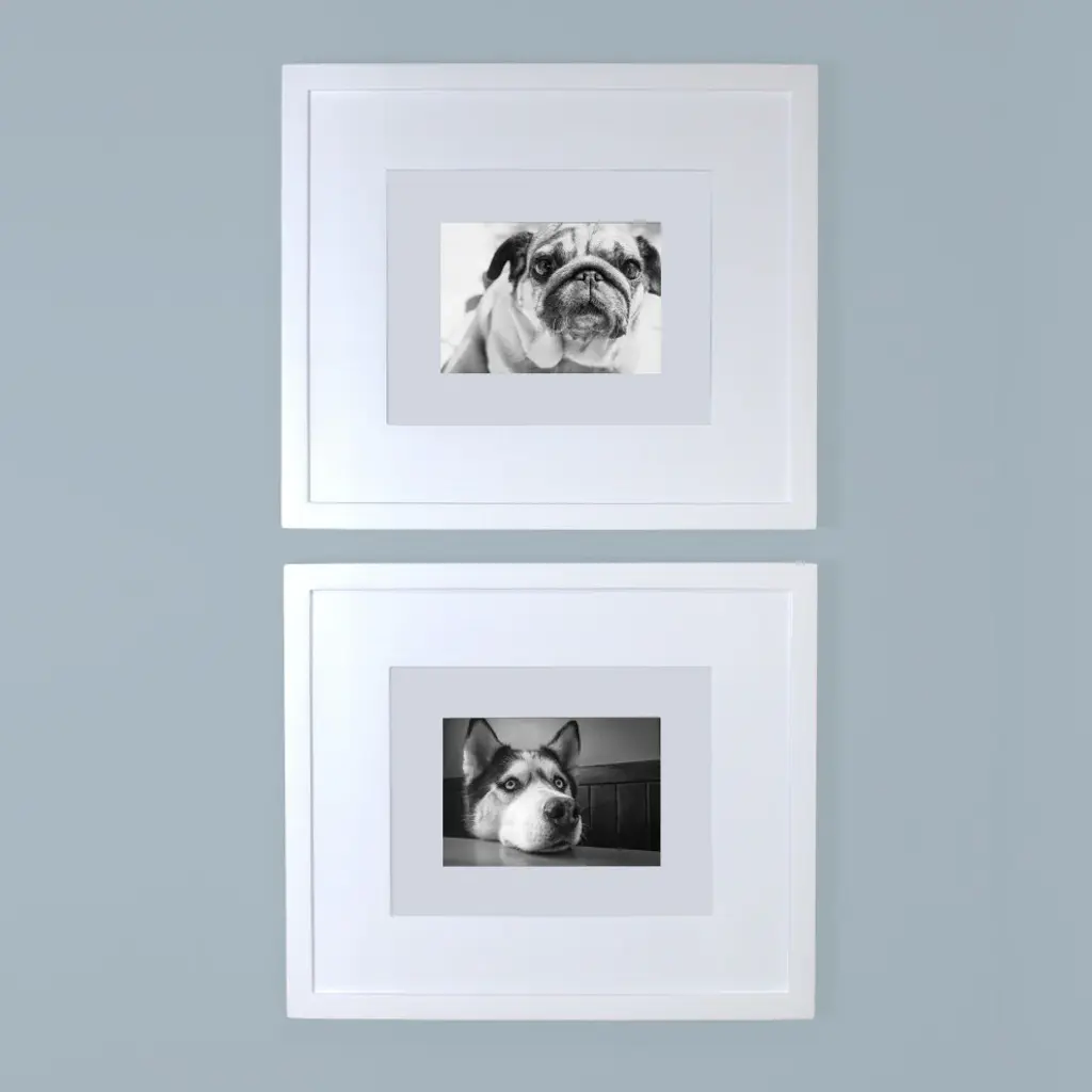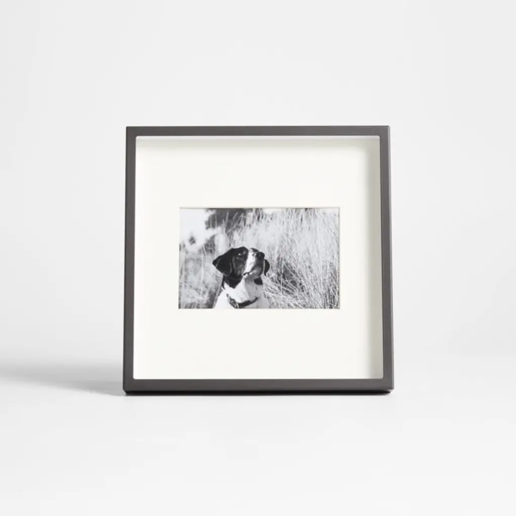 Our brushed silver frame adds sparkle and drama to photo displays with its shadow-box styling and oversized off-white mat. The square frame sets off rectangular photos for a unique silhouette. A Crate & Barrel exclusive, our aluminum 4x6 frame with a silver finish can be displayed on a mantel, bookshelf or wall.