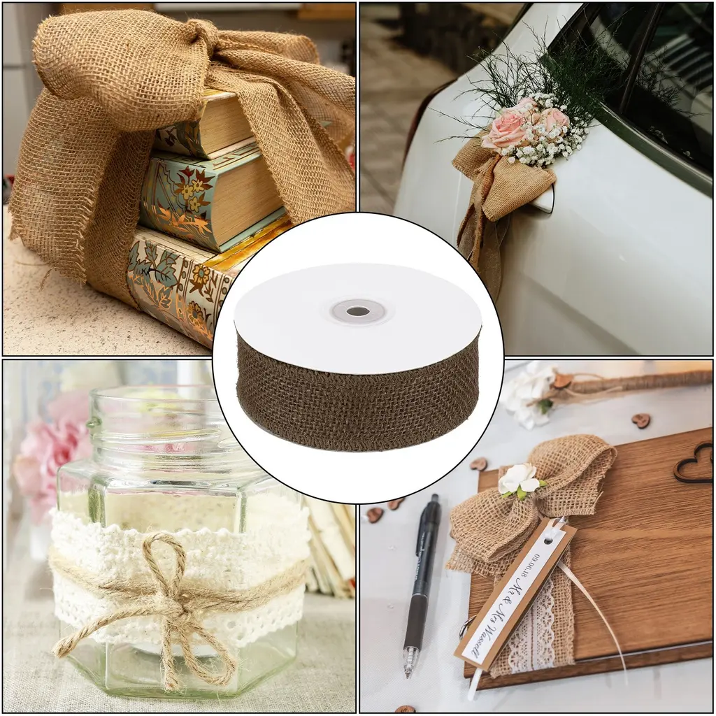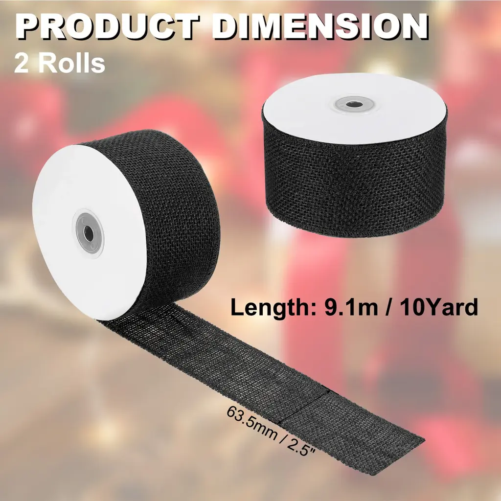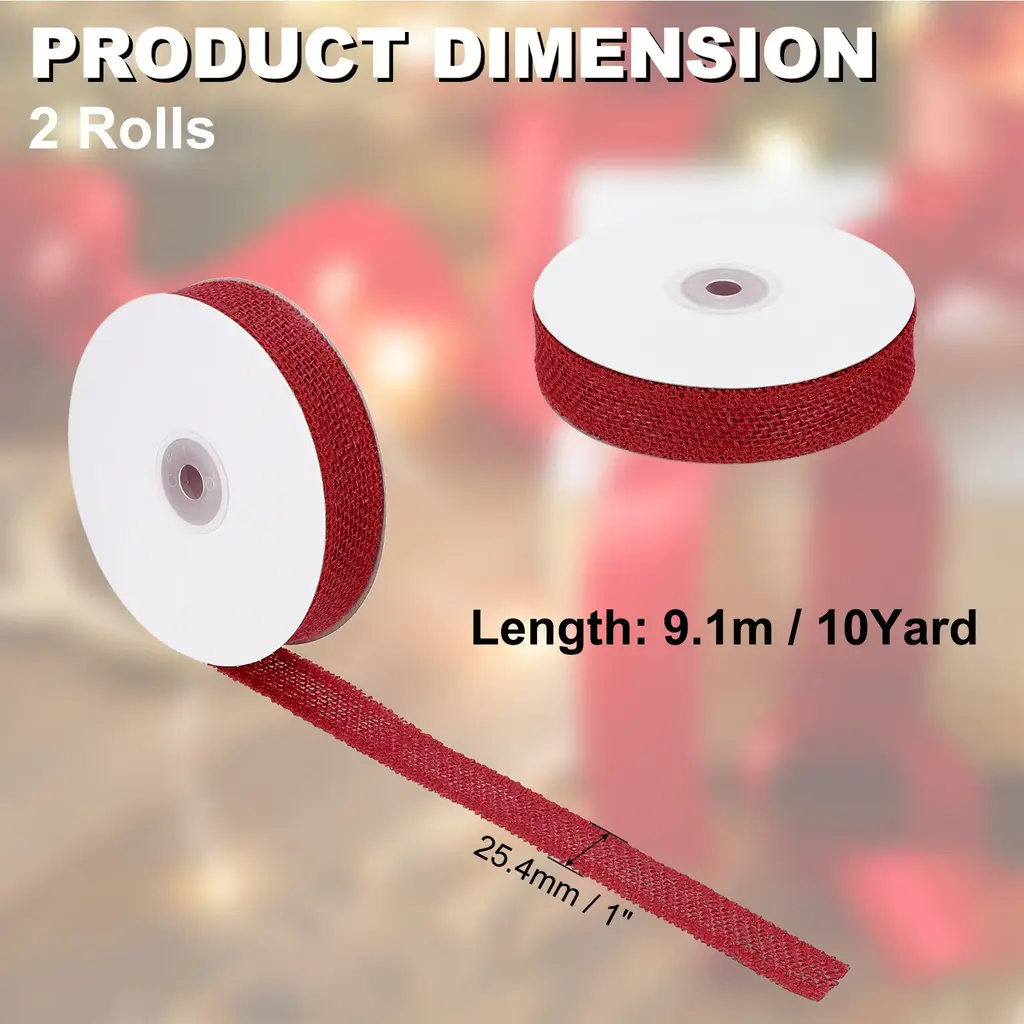 The burlap ribbon is perfect for a variety of occasions, including Christmas celebrations, weddings, parties, and home decoration. It can be used to decorate christmas trees, tables, chairs, vases, bouquets, photo frames, and more. The natural look of the ribbon adds a cozy and warm feel to any space.SpecificationColor: BrownMaterial: JuteSize:1.5 inch x 10 Yard / 38.1mmx9.1m (W*L)Packing List: 2 x Burlap Fabric RibbonAdvantageThe burlap ribbon is flexible yet stiff enough to maintain its shape, making it an excellent choice for burlap trim and wreath making supplies. The natural jute fabric adds a rustic touch to any project, and the ribbon is durable and long-lasting.InstructionTo use the Burlap Ribbon, simply unroll the desired length and cut with scissors. The ribbon can be tied, twisted, or wrapped around objects to add a decorative touch. It can also be used to create bows or other embellishments.Note: When using the Burlap Ribbon, be careful not to get it wet, as it may cause the fabric to shrink. Additionally, avoid exposing the ribbon to direct sunlight for extended periods, as this may cause the color to fade. Finally, keep the ribbon away from open heat sources.