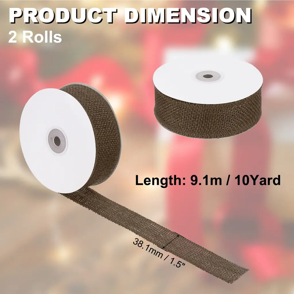 The burlap ribbon is perfect for a variety of occasions, including Christmas celebrations, weddings, parties, and home decoration. It can be used to decorate christmas trees, tables, chairs, vases, bouquets, photo frames, and more. The natural look of the ribbon adds a cozy and warm feel to any space.SpecificationColor: BrownMaterial: JuteSize:1.5 inch x 10 Yard / 38.1mmx9.1m (W*L)Packing List: 2 x Burlap Fabric RibbonAdvantageThe burlap ribbon is flexible yet stiff enough to maintain its shape, making it an excellent choice for burlap trim and wreath making supplies. The natural jute fabric adds a rustic touch to any project, and the ribbon is durable and long-lasting.InstructionTo use the Burlap Ribbon, simply unroll the desired length and cut with scissors. The ribbon can be tied, twisted, or wrapped around objects to add a decorative touch. It can also be used to create bows or other embellishments.Note: When using the Burlap Ribbon, be careful not to get it wet, as it may cause the fabric to shrink. Additionally, avoid exposing the ribbon to direct sunlight for extended periods, as this may cause the color to fade. Finally, keep the ribbon away from open heat sources.